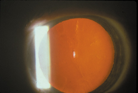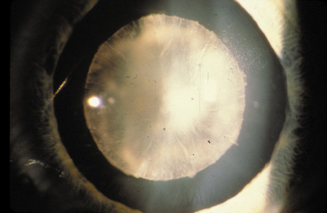 It has been observed that some individuals may have cortical opacities covering the entire anterior cortical and posterior cortical area (Fig. 11), and yet have 20/40 or better Snellen visual acuity under standard testing conditions. However, these patients may have severe disability glare such that under simulated bright lights their visual acuity may decrease to 20/80 or worse.31 They may also have decreased contrast sensitivity. These individuals tend to do well indoors but have difficulty driving during bright, sunny days, and at night because of oncoming headlights. Treatment in these cases must be decided on an individual basis, and surgery may be indicated when the expected benefits outweigh the surgical risks.