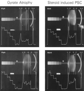 This type of cataract is best seen with retroillumination, which gives an enhanced picture of the cortical spokes and vacuoles by the shadows they cast as the light is reflected back by the fundus. Direct illumination helps clarify the level of the opacities (see discussion in the Posterior Subcapsular Cataract section below). |