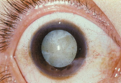 WILSON'S DISEASE Wilson's disease, which is characterized by increased serum copper levels and the deposition of copper in basement membranes throughout the body, causes a kind of lenticular opacity called sunflower cataract. This is characterized by a fine, powdery deposition of copper just underneath the lens capsule, which gives it a brilliant yellow, brown, or red sheen. The deposition is more concentrated in the pupillary area and is disc-like centrally. Extending from this disc-like area are radiating petal-like deposits (hence, the sunflower appearance). These cataracts do not interfere with vision and may resolve with systemic therapy for the increased copper levels.89 FABRY'S DISEASE Fabry's disease occurs secondary to an abnormality in lipid metabolism, and is characterized by feathery opacities radiating in the posterior subcapsular regions.90 These cataracts are mild and seldom cause significant visual symptoms HOMOCYSTINURIA In 90% of patients with homocystinuria, the zonules show abnormalities leading to a subluxation of the lens that is often in the inferonasal direction.91 Occasionally, congenital cataract is associated with this condition.92 Patients with homocystinuria have thrombotic tendencies and must be monitored carefully when they are under general anesthesia REFSUM'S DISEASE Refsum's disease, whic is a condition of abnormal lipid metabolism, is often associated with PSCs.93 Patients with this disease have an atypical pigmentary degeneration of the retina. |