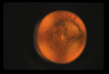 retinitis pigmentosa (Fig. 31), gyrate atrophy (Fig. 32), and Usher's syndrome (Fig. 33) show finger-like projections. In persistent hyperplastic primary