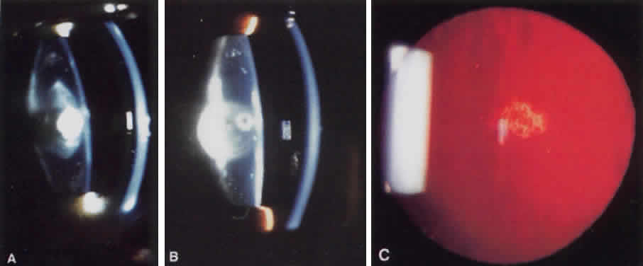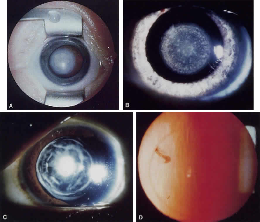 Mature or total cataracts may represent a late stage of any of the above types of cataract, in which the entire lens is opacified (Fig. 5). Membranous cataracts result from resorption of lens proteins, often from a traumatized lens, with resulting fusion of the anterior and posterior lens capsules to form a dense white membrane. They usually cause severe loss of vision. |