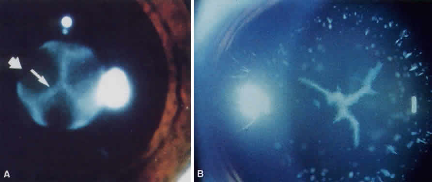 cause. Defined by age at onset, a congenital or infantile cataract is visible in the first year of life, a juvenile cataract occurs in the first decade of life, a presenile cataract occurs before the age of 45 years, and the so-called senile or age-related cataract occurs thereafter. The age of onset of a cataract does not necessarily indicate its cause. Congenital cataracts may be hereditary or secondary to a noxious intrauterine event. Cataracts associated with a systemic or genetic disease may not occur until the second or third decade (e.g., cataracts associated with retinitis pigmentosa). Even age-related cataract, thought to be due to multiple insults accumulated over many years, have a genetic component, making certain persons more vulnerable to the environmental insults. Several classification systems have been developed based on the anatomic location of the opacity. In an attempt to deal with congenital cataract, Merin43 proposed a system based on morphologic classification: the cataract is classified as total (mature or complete), polar (anterior or posterior), zonular (nuclear, lamellar, sutural), and capsular or membranous. Because, as discussed above, lens development follows a well-documented timed sequence, the location of a lens opacity provides information about the time at which the pathologic process intervened, thereby helping to determine the cause. Nuclear opacities from the most central region outward denote cataract formation occurring at the time of the development of that portion of the involved lens nucleus—embryonic (first 3 months), fetal (third to eighth month), infantile (after birth), or adult. Because the lens fibers are laid down constantly throughout life, lens opacities that develop postnatally present as cortical opacities or appear just beneath the posterior lens capsule as subcapsular opacities—for example, cataracts caused by topical steroid drugs and radiation. Polar opacities involve either the anterior or posterior pole of the lens and may include the posterior subcapsular lens cortex extending to the lens capsule (Fig. 2). Posterior subcapsular cataracts can also occur secondary to a variety of insults. Although they have been associated with proliferation of dysplastic bladder-like fiber cells called Wedl cells, at least some posterior subcapsular cataracts appear to be due to abnormalities of the posterior fiber ends.44 When both anterior and posterior poles are involved, the term bipolar is used. Isolated anterior polar cataracts are usually small, bilateral, and nonprogressive and do not impair vision. They may be inherited as an autosomal dominant trait45 or may be associated with microphthalmos, persistent pupillary membrane, or anterior lenticonus. Posterior polar cataracts also may be inherited as a dominant trait46 or may be sporadic and unilateral; they can be associated with abnormalities of the posterior capsule, including lentiglobus or lenticonus, or with remnants of the tunica vasculosa. Although usually stable over time, they may progress and can be associated with capsular fragility. Nuclear cataracts show opacities in the fetal or fetal and embryonic lens nucleus (Fig. 3). They can show a wide variation in severity, from dense opaci-ties involving the entire nucleus to pulverulent (or dusty-appearing) cataracts involving only the central nucleus or discrete layers (see below). Lamellar cataracts (see Fig. 3) affect lens fibers that are formed at the same time, resulting in a shell-like opacity at the level at which the fibers were laid down at the time of the presumed insult. They are the most common type of congenital cataract and may be inherited in a dominant fashion.47–52 Some cataracts have associated arcuate opacities in the cortex called cortical riders. Sutural or stellate cataracts (Fig. 4) affect the regions of the fetal nucleus on which the ends (or feet) of the lens fibers converge, called the Y sutures. These are visible by slit-lamp biomicroscopy as an upright Y anteriorly and an inverted Y posteriorly, even in normal lenses. Theories of cataract development53 suggest that abnormalities in lens fiber development or maturation may predispose to cataract development later in life. This is supported by examples in animals (the Philly mouse) and in humans (gyrate atrophy).54 Sutural cataracts can also be inherited as autosomal dominant traits.47 Cerulean or blue dot cataracts are characterized by numerous small bluish opacities in the cortical and nuclear areas of the lens.52
