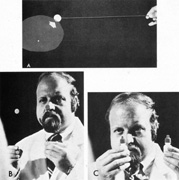 | Fig. 14. Use of colored objects to detect and plot central scotomas. A. The limits of the defect are most easily defined when the target subjectively increases in color intensity as it is moved out of scotoma. B. Two identical, colored targets are used for simultaneous comparison, one centrally (on nose), the other at approximately 10°. Normally, the target fixated centrally appears brighter. C. Use of brightly colored bottle tops (mydriatic red) for color comparison. |