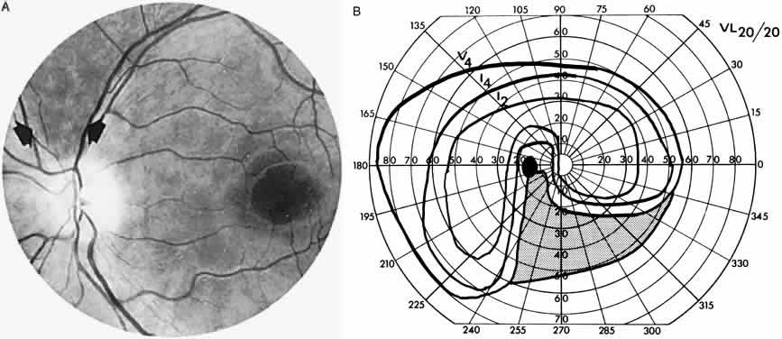 | Fig. 9. An 18-year-old student with recurrent episodes of left retinal migraine. After a typical attack, he noted an inferior field defect. A. Fundus shows a defect in the superior arcuate nerve fiber bundle (between arrows: compare fiber layer below disc). B. Visual field defect corresponds to a retinal nerve fiber layer defect. |