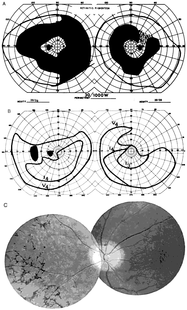 PIGMENTARY RETINOPATHIES Heredodegenerative retinal disorders such as retinitis pigmentosa are almost always separable from “neurologic” causes of visual deficits on the basis of chronicity, bilaterality, and typical funduscopic appearance of pigmentary retinopathy, attenuated arteriolar tree, and waxy disc pallor. “Retinitis pigmentosa” is actually a misnomer twice over: the progressive photoreceptor degeneration is not inflammatory, as “-itis” would imply; and pigmentary changes evolve relatively late and may not be obvious. The term “retinitis pigmentosa sine pigmento” is not a separate entity, but it represents a stage of disorder when the retina appears relatively unaltered but photoreceptor function is defective. A thorough account of retinal photoreceptor dystrophies is beyond the scope of neuro-ophthalmologic subjects, but A. C. Bird's Jackson Lecture6 provides an overview of current concepts of clinical classification, molecular biology, and therapeutic advances. Hereditary transmission may follow autosomal dominant or recessive, or X-linked, patterns, with a spectrum of responsible gene mutations. Indeed, molecular geneticists have now identified numerous mutations in literally dozens of genes that are associated with or cause photoreceptor degeneration, findings suggesting an extraordinary vulnerability of these cells, possible stemming from their high-oxygen-requiring metabolism and physiologic population culling. These detailed genetic elaborations are replacing imprecise, if more classic, clinical descriptions.6 In the fully developed disorder, there is usually profound constriction of the fields with relative sparing of the central fixational area, resulting in so-called “gun-barrel” or “tubular” field constriction. End-stage retinitis pigmentosa is actually one of the few organic causes of markedly narrowed visual fields. The causes of such “gun-barrel” field constrictions are listed in Table 1. The retained field function actually mimics a cone (see Volume 2, Chapter 2, Fig. 19), because the central remnant enlarges as the testing distance is increased between the patient and, for example, the tangent screen. The field diameter does not enlarge with increasing testing distances in hysteria or malingering, and, in fact, the diameter of the field may shrink further if this possibility is suggested to the naive patient.
