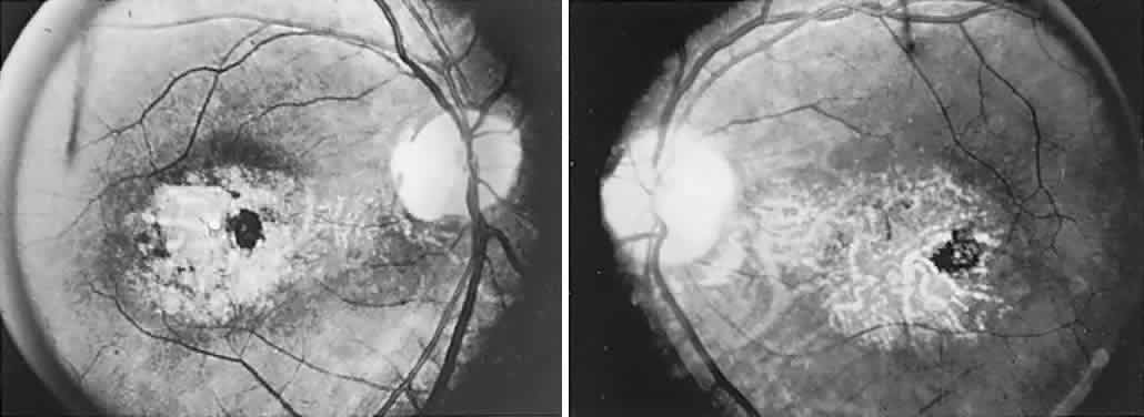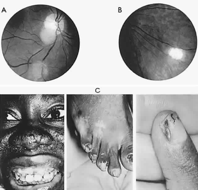 by an episode of cervical myelopathy. Acute multifocal retinitis, another idiopathic inflammation in eyes of healthy young to middle-aged adults, may be associated with optic disc edema and may follow flulike prodromes.24 Mild vitrous reaction and macular exudative stars are characteristic, and a self-limited benign outcome is usual, with no evidence of specific infectious or autoimmune causes. Other relatively acute multifocal chorioretinal inflammations include presumed ocular histoplasmosis, coccidioidomycosis, Pneumocystis carinii infection, cryptococcosis, mycobacterial or syphilitic choroiditis, birdshot (vitiliginous) retinochoroidopathy, punctate inner choroidopathy, and acute multifocal posterior placoid pigment epitheliopathy (AMPPPE). Although specific infectious agents may also be incriminated in meningeal reactions, such as cryptococcosis, AMPPPE is associated with CSF pleocytosis and protein elevation, findings suggesting possible viremia.25 The foregoing discussion has focused on retinal pigmentary and macular disease in relation to neurologic disorders, not simple isolated macular dystrophies, which are considered at length elsewhere.23,26 |