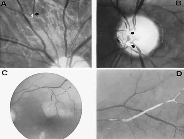 neuropathies (see Part II of this chapter). The onset of retinal arterial occlusion rarely goes unnoticed by the patient, but unlike venous thrombosis, arterial occlusions of a minor degree may be difficult to discern ophthalmoscopically, especially if days or weeks pass before the fundus is examined. Muci-Mendoza et al42 used fluorescein fundus angiography to demonstrate ophthalmoscopically occult emboli and post-embolic endothelial damage after episodes of amaurosis fugax (see below, Carotid Atheromatous Disease). With acute infarction, the retina becomes opaque and takes on a creamy or gray appearance. Atheromatous material in the form of “bright plaques” of cholesterol or other microemboli may be seen, especially lodged at arterial bifurcations (Fig. 5). Segmental arteriolar mural opacification (see Fig. 5D) may follow retinal microembolization by weeks to months, and such sheathing may be as useful as the recognition of the cholesterol embolus itself.43 ERG may show diminished B-wave amplitude, a finding indicating inner retinal ischemia. Weeks following retinal infarction, the optic disc becomes pale, and the arterial tree becomes narrowed in the sector corresponding to the arterial occlusion. The visual field defects with arterial occlusion are variable, but they usually take the form of arcuate scotomas or “altitudinal hemianopias” of the superior or inferior half fields (Fig. 6). These altitudinal or pseudo-quadrantic defects are dense and are easily discovered by hand- or finger-counting confrontation techniques. The localizing value of the position of the “vertex” of quadrantic and wedge-shaped defects was pointed out by Alfred Kestenbaum. When the wedge originates at or points toward the blind spot, the defect is due to a retinal arterial occlusion or a lesion at the edge of the optic disc (including the arcuate defects seen in glaucoma). The differential diagnosis of arcuate scotomas, that is, with radial borders originating at the blind spot (see Fig. 6, right field), includes glaucoma, ischemic optic neuropathy, branch retinal artery occlusion, hyaline bodies of optic disc, congenital optic pit, juxtapapillary inflammation, and, rarely, chiasmal interference (see Volume 2, Chapter 6, Fig. 1F). CAROTID ATHEROMATOUS DISEASE The pathogenesis of embolic retinal arterial occlusions is diverse, but most are associated with atheromatous degeneration of the cervical carotid arteries. Since the observations by Fisher44 of mobile intravascular material during episodes of transient retinal ischemic episodes (amaurosis fugax), an embolic source is commonly invoked, especially when any material is detected ophthalmoscopically within the retinal circulation. Such retinal emboli have been examined histopathologically and may consist of cholesterol crystals,45 platelet aggregates,46 fibrin and blood cells,47 and neutral fat.48 A study of the prevalence of asymptomatic retinal emboli among 3654 persons aged 49 years or older disclosed photographic evidence in 1.4%, the majority being judged as cholesterol; risk for subsequent stroke is not yet calculated.49 On the other hand, the incidence of visible emboli in retinal arterial occlusion is estimated at about 20%.50 Wilson and coworkers51 compared the incidence of carotid and cardiac disease in 103 patients with retinal artery occlusions and reported cardiac valve abnormalities in 28; of 62 carotid arteriograms, 35% were normal, 13% were occluded, and the remainder showed irregularity or significant stenosis. In a small group of 41 patients with transient monocular visual loss or retinal artery occlusion, no cardiac or carotid source was uncovered in two-thirds of subjects, ipsilateral carotid disease was seen in 11 (27%) cases, and a cardiac source was noted in a single patient.52 Even in those patients without ophthalmoscopically visible emboli, it is possible that the embolus either has lodged in the retro-laminar portion of the optic disc or has disintegrated and passed to the retinal periphery. Primary thrombosis in the retinal arterial circulation, beyond evidence of frank vasculitis or hypercoagulable states, is considered obsolete. Vasospasm, on the other hand, is an unlikely candidate to explain arterial occlusion, although rare instances of otherwise unexplained transient visual loss are reported.53 Other noncarotid sources of emboli, including cardiogenic, are discussed below. Transient ischemic episodes involving the retinal arterial tree produce the well-known symptom of amaurosis fugax (“fleeting darkness, or blindness”; ocular transient ischemic episode). This phenomenon may be defined as a painless unilateral, transient loss of vision that usually progresses from the periphery toward the center of the field. Often, the visual deficit takes the pattern of a dark curtain descending from above or ascending from below. Complete or subtotal blindness follows in seconds and lasts from 1 to 5 minutes (rarely longer). Vision returns to normal within 10 to 20 minutes, at times by reversal of the pattern of progression. Incomplete variations produce less distinctive sensations such as “looking through a fog … through raindrops … through haze.” By convention, the term amaurosis fugax is reserved for the ocular symptoms as described, which are usually distinguishable from other episodic visual disturbances (see Volume 2, Chapter 1), and it implies transient ischemia in retinal arterial circulation. Those conditions with principally monocular transient visual loss are listed in Table 3.54 It is likely that microembolic material in the form of fibrin-platelet aggregates momentarily occludes retinal vessels, then fragments and passes into the retinal periphery. If disaggregation with reconstitution of blood flow does not take place within several minutes, ischemic damage to inner retinal layers may be irreversible, and permanent visual defects may ensue. Most evidence indicates that the major source of retinal micro