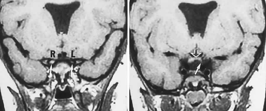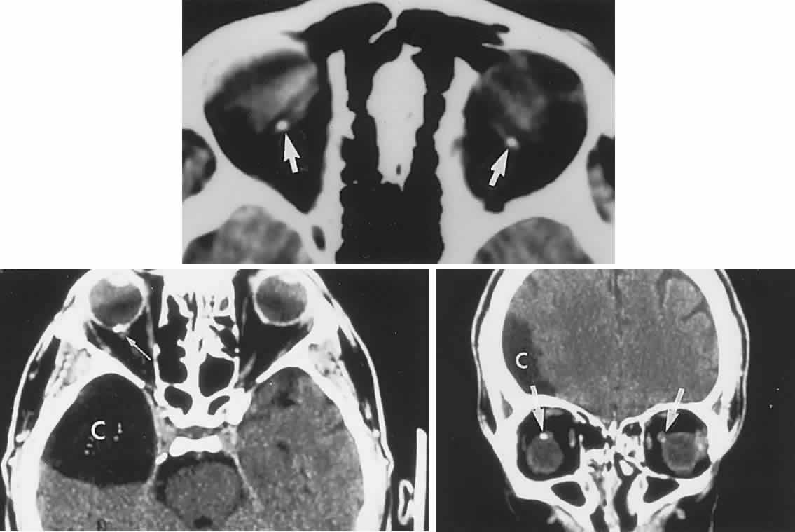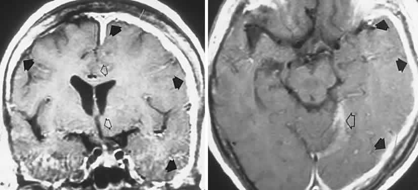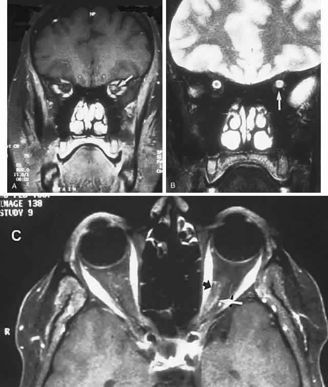Histopathologically, zoster involves the optic nerve as an inflammatory arteritis with associated mild leptomeningitis. With these lesions in mind, it was believed that the recovery of vision in the patient in the above case was directly attributable to intraorbital and systemic steroids. Diffuse idiopathic perioptic meningeal thickening (cranial fibrosclerosis; hypertrophic pachymeningitis) is a relatively rare cause of progressive visual loss, with or without associated systemic multifocal fibrosclerosis.264 Signs and symptoms include chronic headaches, optic disc atrophy or edema, meningeal thickening on MRI (Fig. 36), CSF pleocytosis and protein elevation, dural sinus thrombosis, and cranial nerve palsies producing ophthalmoplegia, hearing loss, and facial palsies. Other causes of pachymeningitis must be ruled out, including sarcoidosis, tuberculosis, syphilis, rheumatoid arthritis, dural carcinomatosis, meningioma-en-plaque, and plasmacytoma. These conditions may be distinguished by accompanying clinical findings and definitive meningeal biopsy. Corticosteroid and immunosuppressive agents are undoubtedly useful. |