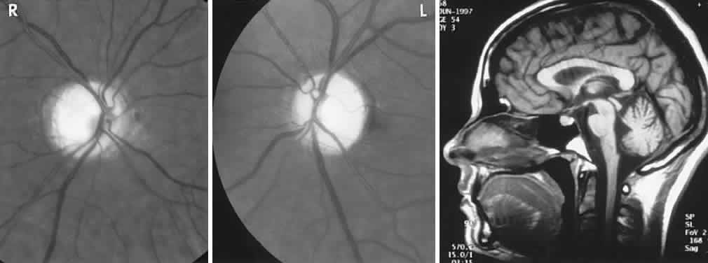 optic neuropathies. Conversely, progressive visual defects may be attributed to “glaucoma” when no such condition exists. Here, the interpretation of visual field defects is critical, and the judicious use of radiologic studies is mandatory. Greenfield et al388 found that only 2 of 31 patients diagnosed initially with glaucoma had neuroradiologic evidence of mass lesions, and in both instances other neuro-ophthalmic signs had been overlooked, including optic disc neural rim pallor. Defects that preferentially involve the nasal field, but without a hemianopic character (aligned on the vertical meridian) are most likely due to glaucoma or ION. Bilateral nasal field defects that are truly hemianopic must be extraordinarily rare. Otherwise, binasal defects may be associated with chronic papilledema or hyaline bodies of the nerve head, either of which should be discernible by ophthalmoscopy. |