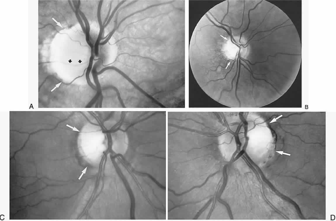 of ION. A brief anatomic review of the vascular supply of the optic nerve may be summarized. The nerve fiber layer at the surface of the disc is supplied by small papillary capillaries of the central retinal artery branches, whereas the major prelaminar disc substance is nourished by peripapillary choroidal arterioles from the elliptic anastomotic annulus formed from the short posterior ciliary arteries (see Volume 2, Chapter 4, Fig. 4).265,266 The perforated lamina cribrosa of the scleral wall, and this section of the optic nerve, is also supplied by centripetal arterioles of the partial arterial circle (Zinn-Haller) formed by branches of the posterior choroidal arteries. Consensus dictates that the central retinal artery does not contribute in any significant way to these anterior portions of the nerve. The immediate retro-laminar segment is supplied by recurrent pial arterioles of the peripapillary circulation, and pial capillaries of the central retinal artery running in the fibrous supportive septa of the nerve. Venous drainage is principally via the central retinal vein and variable peripapillary optociliary collaterals. These latter vessels may enlarge in conditions of chronic nerve sleeve obstruction, such as papilledema and meningeal infiltration, forming ophthalmoscopically visible shunts at the disc perimeter (see Color Plate 5-4F). The orbital and canalicular segments of the optic nerve are supplied by penetrating capillaries of the peripheral pial plexus of the ophthalmic artery and, to some extent, by the intra-axial central retinal artery circulation. The likely influence of these vascular patterns is discussed below. COMMON (ARTERIOSCLEROTIC, NON-ARTERITIC) ISCHEMIC OPTIC NEUROPATHY In contrast to inflammatory or demyelinative retro-bulbar optic neuritis, ION characteristically involves the prelaminar portion of the optic nerve with a constant ophthalmoscopic appearance of disc swelling (thus, the alternate term “anterior” ION) (Fig. 37 and Color Plate 5-3A). In fact, the absence of disc swelling with acute monocular loss of vision makes a diagnosis of “simple” ischemic infarction untenable. The rare exception to this rule is retro-bulbar ION associated with cranial arteritis (see below). Otherwise, abrupt visual loss in the elderly patient with a normal optic disc should bring to mind the possibility of other lesions, including rapidly expanding basal tumors or carcinomatous infiltration of the optic nerve sheaths. Common ION may be generally characterized as follows:267–269 age- and sex-adjusted incidence rate as high as 10/100,000; slight male predominance (about 62%) and extremely uncommon in black persons; peak median age 66268 or 72 years,267 but on rare occasions ION may occur in the late forties; hypertension in more than 40% to 50% and diabetes in 25%, these risk factors being of greater importance with onset in the slightly younger subset; many, perhaps most, patients noting visual symptoms on awakening; sudden onset of altitudinal267,270 or other field defects (see Fig. 6), usually, but not invariably, involving the central fixational area and producing reduced acuity, ranging from 20/20 to no light perception, with one-half of patients seeing better than 20/60, and one-third seeing 20/200 or worse; visual deficits typically maximal at onset, but deterioration may progress for a few days to several weeks270,271; recurrent disc infarcts in the same eye are considered relatively rare.272 Results of the Ischemic Optic Neuropathy Decompression Trial271 indicate that untreated eyes show a spontaneous improvement rate of three or more optotype lines in 43%, and visual deterioration in 12%; other studies273 provide variable results (see below). Unlike infarction with cranial arteritis, premonitory ocular symptoms do not occur, and significant eye or brow discomfort, or headache, is exceptional, perhaps in about 10%, unlike optic neuritis, in which orbital ache or pain on eye movement is a prominent symptom (see above). The optic disc is swollen to some degree (see Fig. 37), usually in a sector with small flame hemorrhages, and edema typically extends only a short distance beyond the border of the disc. It has been suggested that altitudinal swelling, pallor, arterial attenuation, and hemorrhage are found more commonly in anterior ION than in optic neuritis.190 In addition, a presymptomatic phase of disc swelling may be observed274; for example, a patient presents with characteristic ION with visual loss in one eye, and disc edema with good visual function surprisingly is found in the contralateral fundus; after a brief delay, disc edema progresses, and vision usually declines. Perhaps this odd situation is related to chronic or subacute nerve ischemia with obstipation of axoplasm flow, but without significant nerve fiber infarction. Clinical and experimental studies275 indicate that ION is precipitated by insufficiency in posterior ciliary artery circulation, more likely resulting from a reduction in critical perfusion pressure than from embolism or thrombosis, and that branches of the peripapillary choroidal arterial system become ischemic, with consequent infarction of retinal nerve fiber bundles in the disc substance anterior to the lamina cribrosa. Olver and associates276 studied the morphology of the microvasculature of the retro-laminar area of the human optic nerve and described an elliptic anastomosis (“circle of Zinn-Haller”) of branches of the medial and lateral para-optic short posterior ciliary arteries. This ellipse is divided into superior and inferior portions by the entry points of these branches into the eye, providing potential superior and inferior “altitudinal” blood supplies to the retro-laminar optic nerve that may play a role in the pathogenesis of the upper- or lower-half patterns of visual field defects frequently found in ION. Fundus fluorescein angiography in 41 instances of nonarteritic ION, less than 3 weeks after onset, 