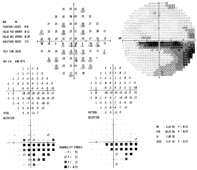 Indolent fungal infections with minimal sinusitis may present as orbital apex syndrome, including rapidly advancing or chronic, progressive optic neuropathy. Of these, mucormycosis430 (with or without diabetes) and aspergillosis431 are most frequent, at times mimicking cranial arteritis, with facial pain, retinal vascular occlusions, or ophthalmoplegia, for which aggressive corticosteroid therapy may prove disastrous. Early transnasal endoscopic exploration for biopsy is vital. Wegener's granulomatosis (“lethal midline granuloma”) is a necrotizing vasculitis with a predilection for the upper respiratory tracts, at times heralded by nasal and sinus congestion and discharge, and destruction of midline nasal cartilage. Pulmonary nodules or infiltrates and glomerulonephritis with hematuria fulfill the other clinical criteria, and orbital inflammation is common. Isolated retro-bulbar neuropathy has been documented,258 and ocular signs may signal this disorder in up to 17% of cases.432 Ophthalmic complications include the following: episcleritis and scleritis; corneal ulceration; uveitis; retinal vasculitis and optic neuropathy; and granulomatous inflammation of lacrimal glands, salivary glands, orbital soft tissue, and paranasal sinuses. Meningocerebral inflammation, a form of pachymeningitis detectable by enhanced MRI, produces headache, seizures, and cranial neuropathies.433 Antineutrophilic cytoplasmic antibody (c-ANCA) assay provides highly specific laboratory confirmation, but absence does not rule out this disorder, and biopsy of nasal or sinus tissues commonly shows typical vasculitic, granulomatous inflammation.422 Corticosteroids and immunosuppressants such as methotrexate are the usual therapies. Intranasal cocaine abuse can produce a type of chronic ischemic mucoperichondritis and osteolytic sinusitis, at times with nasoseptal perforation, and variably associated with signs of orbital inflammation and contiguous inflammatory optic neuropathy.434 Tumors of the nasopharynx and paranasal sinuses rarely present primarily as visual loss, but may eventually involve the optic nerve when the posterior ethmoidal or sphenoidal sinus is invaded. Occurring predominantly in men at least in the sixth decade of life, squamous cell carcinoma is the most common type, typically in the maxillary sinus, less frequently the ethmoid complex, and rarely the frontal or sphenoid sinuses. From the excellent review of Harbison and associates,435 in sphenoidal malignancies, headache and diplopia (cranial nerves III, IV, VI, and V) are more usual complaints than visual loss, which involved only 5 of 42 patients in the Harbison series. Visual loss is subacute or rapidly progressive to blindness. Other signs and symptoms, that is, facial pain or anesthesia, radiologic findings, and biopsy usually confirm the diagnosis. Esthesioneuroblastoma, a malignant neuroectodermal tumor originating in olfactory nasal mucosa, is reported to produce rapidly progressive visual loss,436 although presenting symptoms more commonly include nasal obstruction, epistaxis, facial numbness, diplopia, and proptosis. In patients subjected to radiation therapy for malignant nasopharyngeal tumors, loss of vision months after therapy may be attributable to delayed radionecrosis of the optic nerve (see below), but recurrence and spread of tumor must be considered. ORBITOPATHIES: GRAVES' DISEASE A variety of orbital disease, including inflammations, trauma, and tumor, may produce optic nerve dysfunction. The ophthalmopathy of Graves' disease is not only a frequently overlooked cause of spontaneous diplopia, but visual loss due to orbital congestion may be mistakenly attributed to corneal exposure and tear film problems (see Volume 2, Chapter 14). By mechanisms not yet entirely elucidated, the optic nerve may participate in the orbitopathy associated with dysthyroid states or even in apparent euthyroidism. Extraocular muscles are enlarged by endomysial fibrosis, mucopolysaccharide deposition, and perivascular lymphocyte and plasmacyte infiltration. Morphologically, the optic nerves are encroached on by swollen muscles at the tight orbital apex,437,438 and on the basis of ultrasonography and CT, or MRI, it is indeed likely that the optic nerve is compressed by the confluence of enlarged recti muscles in the posterior orbit, but prolapse of orbital fat through the superior orbital fissure is also a possible mechanism.439 There is a loss of large-type axons in the proximal segment of the orbital portion of the optic nerves, associated with mild astrocyte increase, but the nerve and meninges are not inflamed.440 It is estimated that optic nerve dysfunction occurs in some 6% of patients with Graves' orbitopathy.441 As a rule, at the onset of optic neuropathy, many patients are clinically euthyroid, having been treated previously for hyperthyroidism. Middle-aged patients with otherwise well-developed, but not necessarily severe, ophthalmopathy present with usually insidious loss of central vision in one or both eyes. Ocular motility is frequently restricted at this stage, and corneal exposure may be minimal. Care should be taken not to attribute a disproportionate visual loss to minor corneal complications and ignore the potentially blinding optic neuropathy, the tests for which have been outlined (see Volume 2, Chapter 2). Acuity may be as poor as finger-counting or only minimally diminished, but color sense is uniformly faulty. Visual fields demonstrate central scotomas, often combined with inferior nerve fiber bundle defects (Fig. 45). The latter defects may be confused with those of glaucoma, especially if intraocular pressure is spuriously elevated by restrictive myopathy (see Volume 2, Chapter 14). The ocular fundus may be entirely normal, or various degrees of disc swelling may be observed (Fig. 46), but, apart from profound atrophy, the state of the disc has little prognostic correlation with eventual visual outcome.442 The natural cours