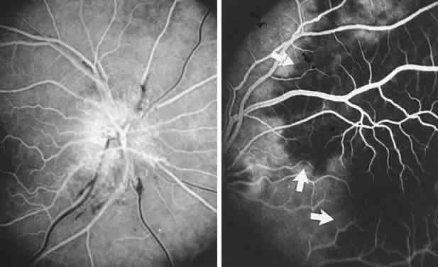 Few cases of biopsy-proved CA occur in patients younger than age 50 years, and instances of “juvenile temporal arteritis” represent focal and benign lesions limited to branches of the external carotid artery,307 without the systemic implications of CA in the aging population. The precise origin of CA is not clear, but reports of presence in first-degree relatives, a distinct predilection for occurrence in whites, and an association with HLA-DR1 all suggest a genetic link.308 Apparently, in response to antigens residing in arterial walls, helper T lymphocytes infiltrate and proliferate in situ, and interferon gamma produced by T cells is the key cytokine in the inflammatory cascade, including macrophage activation.309 In the population age 50 years or older, annual incidence rates for CA are estimated at as high as 15 to 30/100,000310; age-specific prevalence rate between ages 60 and 69 years is 33/100,000, and more than age 80 years, 844/100,000.311 Most large series report a female-to-male preponderance of about 3 to 4:1, and this disorder is most prevalent in the white population of European origin. The nosologic relationship of CA (temporal or giant cell) with polymyalgia rheumatica (PMR) is unsettled, although differences are more quantitative than qualitative, with the important exception of the perceived risk of visual loss, varying widely in the literature between 6% and 70%.306 Certainly, both syndromes share clinical features, laboratory abnormalities, arterial histopathologic features, and potential for serious adverse outcomes.312 Perhaps CA and PMR represent a spectrum of the same basic disease, but patients with simple PMR seem successfully managed without the high-dose steroid therapy usually justified in instances of CA, in which blindness is considered more likely. Interestingly, Turnbull312 suggested that the yearly incidence of both CA and PMR has increased because of diagnostic awareness, but that the incidence of severe visual loss has decreased (for the same reason), resulting in a spurious amelioration of disease severity. Visual loss with arteritic ION tends to be more profound than with common ION313; levels of finger-counting to no perception of light are not uncommon. At times, the optic disc is characterized by a milk-pale edema that may extend into the retina,306 some considerable distance away from the optic nerve (see Fig. 37D and Color Plate 5-3D), and central retinal artery occlusion with “cherry-red spot” also occurs. As mentioned, bilateral simultaneous ION is suggestive of CA, and both therapy and laboratory investigations are bent toward that diagnosis. In 50 cases of arteritic ION,314 19 of the 20 patients who had bilateral vision loss had both eyes involved by the time of initial visits; in the Iowa series,306 of 27 patients with bilateral loss, 17% were simultaneous, and second eye loss was delayed 1 to 7 days in 46%, 8 to 14 days in 8%, 15 to 30 days in 8%, and more than 6 months in 8%. Therefore, when second eye infarction occurs in CA, it usually does so within days to weeks, longer intervals being exceptional. The general prognostic value of this point bears emphasis: if the second eye is not yet involved, and patients are under adequate systemic corticosteroid therapy, the likelihood of bilateral visual loss becomes more remote (though not assured) with each passing week. Other signs of orbital hypoxia include evidence of anterior segment ischemia: hyperemia of the conjunctival and episcleral vessels, mild-to-moderate corneal edema, lowered intraocular tension, anterior chamber cellular reaction, iris rubeosis, and rapidly progressive cataract. Irregular streaks and patches of chorioretinal pigmentary disturbances secondary to choroidal ischemia may appear weeks after visual loss (see Color Plate 5-3E), and considerable disc cupping may rapidly ensue, at times mimicking extensive cupping of glaucoma.306,315 Mild visual symptoms associated with punctate retinal infarcts (“cotton-wool spots”) may herald the onset of ocular ischemia,316 and in a series of seven such cases (six biopsy-positive), the authors concluded that prompt corticosteroid therapy led to preservation of vision in all. Diplopia is infrequent, less than 6% in the Iowa series,306 probably reflecting diffuse ischemia of extraocular muscles,317 but preceding symptomatic ophthalmoplegia of any degree may be obscured by the more dramatic occurrence of severe visual loss. Ocular pneumotonography, which measures the ocular pulsation induced by perfusion pressure in choroidal (posterior ciliary) and ophthalmic arteries, has been used318 to distinguish common ION from arteritic ION. In patients with arteritic ION, ocular pulse amplitude was only 4% of pulse amplitude of patients with arteritis but without ION and only 6% of pulse amplitude of patients with nonarteritic ION. Moreover, half the patients with arteritic ION showed pulsation loss in the noninfarcted contralateral eye. Return of pulse amplitudes to a normal range can occur rapidly with systemic corticosteroid therapy, although in some cases the pulse does not revert to normal levels. Bosley and associates319 suggested that ocular pneumoplethysmography, measuring ocular pulse amplitude that reflects the volume changes in the globe with each cardiac cycle, provides a diagnostic accuracy of 94% for CA, rivaling the accuracy of ESR determination or even of temporal artery biopsy. Fluorescein fundus angiography has proved helpful in distinguishing between the common and arteritic forms of ION. Siatkowski and colleagues320 demonstrated that delayed retinal arterial appearance of dye beyond 15 seconds after arm injection, or without full choroidal dye filling (i.e., choroidal nonperfusion) by 18 seconds (Fig. 38), is highly suggestive of the diffuse orbital and choroidal circulation involvement associated with arteritic, but not with common ION, in which mean retinal arterial appearance time was 11.29 seconds, and mean cho