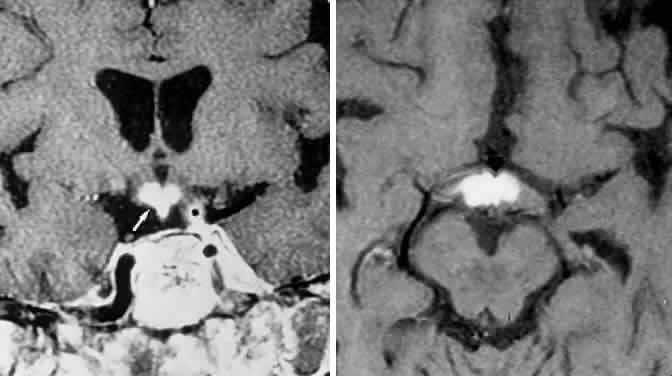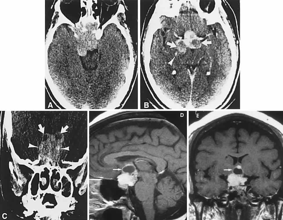 The clinical and radiographic characteristics of primary empty sella were thoroughly reviewed by Neelon and associates,220 the following features being notable: obese women predominate (27 women, 4 men), ranging in age from 27 to 72 years, with a mean age of 49 years; headache is a common symptom; in the Duke University study there was no instance of visual impairment due to chiasmal interference; an enlarged sella was found serendipitously on plain skull films obtained for evaluation of headaches, syncope, or other symptoms; pseudotumor cerebri was present in 4 women; 20 patients had normal pituitary function, and 8 demonstrated endocrine disturbances that included panhypopituitarism, or GH, gonadotropin, and thyrotropin deficiency. Hyperprolactinemia may occur in patients with intrasellar cisternal herniation without evidence of pituitary tumor, but the elevation of serum PRL is usually moderate. For example, in a study221 of 47 patients with empty sella, hyperprolactinemia was found in 6, with a range of 39 to 123 ng/L. Of course, adequate neuroimaging with enhanced CT or MRI (Fig. 20) will resolve the question of empty sella vs. mass lesion. Children are rarely included in this diagnostic category, but they are reported222 with primary empty sella and associated congenital anomalies, including delayed puberty, anosmia, diabetes insipidus, delayed growth, and optic atrophy.223 In a series of 19 patients with primary empty sella at the University of Michigan,224 the following features were noteworthy: all were women; 12 patients complained initially of headache; in 7 patients, visual disturbances were prominent subjective symptoms (blurred vision, diplopia, micropsia); 3 had bilateral papilledema and were believed to have pseudotumor cerebri; and 2 patients demonstrated minimal relative hemianopias without obvious cause. Although it is speculated that the high female preponderance noted in all series implies a mechanism related to physiologic hypertrophy and subsequent involution of the pituitary gland during pregnancy, there was no significant relationship between the number of pregnancies and sellar volume in the Duke University series. In the secondary form of empty sella that occurs following pituitary surgery or irradiation, adhesions may form between tumor “capsule” (or sellar diaphragm) and the optic nerves and chiasm. Retraction of these adhesions may draw the visual system downward into the empty sella, with resulting visual defects.225,226 Packing the sellar cavity prophylactically to elevate the diaphragma has been proposed,224 or “chiasmapexy” when chiasmal herniation is observed at surgical re-exploration.227 |