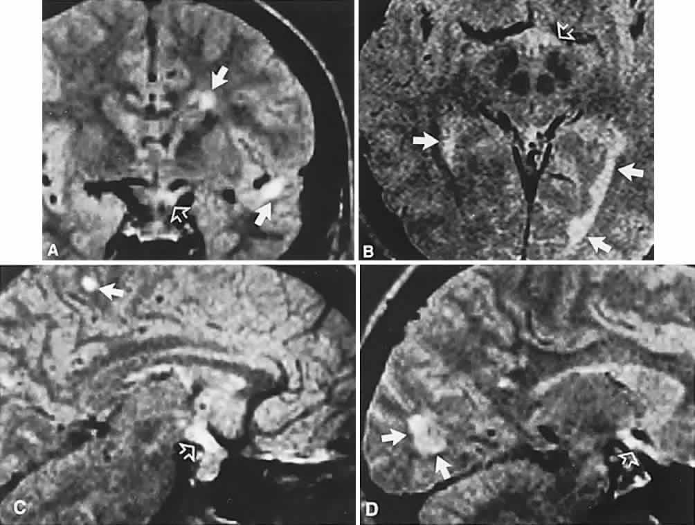 than usual,” even on macroscopic examination. It is a paradox that so few clinical reports have described chiasmal visual field defects in patients with MS, despite the compelling neuropathologic evidence of the high incidence of demyelination at that site. In 1925, Traquair published “Acute Retrobulbar Neuritis Affecting the Optic Chiasm and Tract,”148 in which the visual fields of four patients were recorded; two cases were clearly of a bitemporal pattern (one case appears to be a monocular cecocentral scotoma, and the other shows a homonymous hemianopia), and all were ascribed to MS. Indeed, Traquair believed that chiasmal neuritis would be more frequently found with more exhaustive field analysis. Spector and colleagues149 reported 6 cases of chiasmal neuritis in MS, all women between 20 and 40 years of age; field defects were commonly of a “junctional” pattern, with reduction of acuity in one or both eyes. Of 12 eyes, 9 ultimately attained excellent vision, with an apparently salutary effect of systemic corticosteroids. Abnormal pneumoencephalograms were seen in 2 patients; 1 of these underwent exploratory craniotomy with visualization of a swollen chiasm and right nerve. From the Optic Neuritis Treatment Trial (see Volume 2, Chapter 5, Part II), field defects of chiasmal origin were also documented. According to Lindenberg and associates,150 swelling of the optic nerves and chiasm due to lymphocytic infiltration and astrocytic proliferation may mimic optic glioma. MRI is, of course, most useful in detecting white matter lesions, including the anterior visual pathways (Fig. 10). The place of neuromyelitis optica (Devic's syndrome) in the spectrum of demyelinative syndromes included under the rubric of “multiple sclerosis” is unclear, but neither clinical nor pathologic features seem to isolate “Devic's syndrome” adequately. Usually acute in onset, there is a propensity for occurrence in children and young adults, with severe bilateral visual loss (chiasmal neuritis ?) accompanied by paraplegia due to transverse myelitis usually at a high cervical level. In the case of a 61-year-old woman without evidence of collagen or giant cell arteritis, bilateral visual loss was followed by slowly progressive paraplegia151; postmortem examination disclosed numerous areas of severe demyelination with foci of cystic degeneration extending through several cervical cord segments, with thickening and hyalinization of blood vessels and accumulation of perivascular lymphocytes; the optic chiasm and tracts were demyelinated, and small vessels showed hyalinization, but there were no other demyelinative lesions elsewhere in the hemispheres, brain stem, or cerebellum. Other cases of chiasmal optic neuritis, other than MS, are infrequently documented.152 Purvin and coworkers153 have reported chiasmal neuritis as a complication of Epstein-Barr virus infection, without polyradiculopathy. Ethchlorvynol (Placidyl) has been incriminated as a toxic cause of “chiasmal optic neuritis,”154 and field defects with ethambutol may suggest a bitemporal pattern (see Volume 2, Chapter 5, Part II). The question of opticochiasmatic arachnoiditis is controversial and confusing. Most cases seem complicated by previous trauma, meningitis, encephalitis, hemorrhage, arachnoidal cysts, and even familial optic neuropathies (Leber's type ?). This diagnostic consideration is always tentative, resting on exclusion of other definable mechanisms of visual loss and often requiring craniotomy for verification. Infrequent instances in which other contributing factors are excluded seem genuine. Cant and Harrison155 reported a valid case of progressive visual deterioration associated with growth failure; “the arachnoid of the optic cistern was found to be very much thickened and the brain closely adherent to the left optic nerve.” Surgical lysis of adhesions resulted in rapidly improved vision. Oliver and coworkers156 documented two cases of pathologically verified chiasmal arachnoiditis associated with vascular disease in the form of polyarteritis and meningovascular syphilis. Iraci and colleagues157 documented a case of cystic, adhesive fibrous arachnoidal thickening with lymphocyte and plasma cell infiltration of no known cause. Suffice to add, this vague diagnostic category is shrinking as a result of advances in neuroimaging and spinal fluid analyses. Infectious meningitis may produce visual loss by chiasmal arachnoidal inflammation. In 13 cases of purulent meningitis (including infections with Diplococcus pneumoniae, Staphylococcus, and Pseudomonas aeruginosa), 3 cases of cryptococcal meningitis, and 2 of tuberculous meningitis examined by autopsy at Kobe University, Japan,158 histopathologic changes included the following: polymorphonuclear and lymphocyte infiltration along perivascular spaces in the periphery of optic nerves and chiasm, pial abscesses, and necrosis (and granulomas in cryptococcal cases); perivascular infiltration, endarteritis, necrotizing angiitis, and thrombus formation. Therefore, pathologic processes may be classified as inflammatory and vascular, both of which contribute to demyelinization and axonal degeneration. In this series, no clinical data were included. A 10-year-old girl is reported, with painful visual loss associated with an enlarged right optic nerve and chiasm, and a positive Lyme immunofluorescent immunoglobulin G titer of 1:512.159 With a special propensity to involve the hypothalamus and pituitary region, sarcoidosis infiltrates the chiasm with some regularity and is one of the chief non-neoplastic causes of chiasmal visual loss (Fig. 11). Decker and associates160 reported a case of severe progressive visual loss over only a 2-week interval and CT evidence of an intrasellar and suprasellar granuloma; vision improved after transsphenoidal resection. Tang and colleagues161 recorded four patients with sarcoidosis and characteristic chiasmal defects, including profound visua
