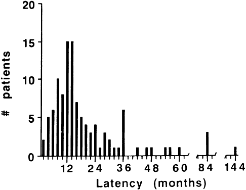 There seems to be no correlation between patient age and interval to onset of visual symptoms. Radionecrosis of the anterior visual pathways usually manifests as a rapidly progressive loss of vision in one eye, the second eye following shortly thereafter in the majority of cases. A rapidly relentless progression to profound visual loss evolves, frequently to total blindness. Initial visual field deficits are typically central scotoma or nerve fiber bundle defects,193 with or without arcuate scotomas. Alternatively, a chiasmal or optic tract pattern may evolve.195 As noted, chiasmal radionecrosis especially may follow radiation therapy to pituitary tumors.193,196,197 Autopsy in two such cases196 revealed perioptic meningeal thickening with patchy demyelination of nerves and chiasm, slight axis cylinder damage, hyaline thickening and perivascular inflammatory cell infiltration of small vessels in the hypothalamus, and necrosis of frontal lobes; necrosis and inflammation of portions of the sphenoid bone with endarteritis of intraosseous vessels. The newer techniques of focal stereotactic (“gamma-knife”) radiosurgery are also reported198 to produce radiation-induced optic neuropathy within 7 to 30 months (Fig. 17). The optic discs initially appear normal, unless there was pre-existing atrophy due to the primary tumor process, but disc edema is occasionally observed. Eventually, marked pallor is evident within 2 months of initial visual loss. This clinical constellation, which occurs within a few months to several years, is highly evocative of radionecrosis, but adequate visualization of the optic nerves and chiasm by gadolinium-enhanced MRI is required to rule out recurrence or extension of the primary tumor. MRI shows often marked enlargement of the nerves and chiasm, and hyperintense signal on contrast-enhanced T1-weighted sequences.199,200 It is imperative that MRIs include thin-section axial and coronal views along the length of the orbital optic nerve segments, preferably with fat-suppression protocols, and precise visualization of the chiasm. Hufnagel and associates201 have recorded the extraordinary occurrence of a malignant glioma of the chiasm 8 years after resection of a recurrent prolactinoma followed with supplemental radiation therapy (5500 cGy). Radiation-induced tumors or other second malignancies are extremely rare, with long latency periods.194 Aristizabal and coworkers202 concluded that, not only do total dosages in excess of 5000 cGy increase morbidity, but also that complications occur even with daily fractions in the range of 200 to 220 cGy per treatment, owing to individual variation in radiation tolerance. Analysis of radiation-induced optic neuropathy after megavoltage external-beam irradiation,203 involving 215 optic nerves in 131 patients with extracranial head and neck tumors, revealed the following: anterior ischemic neuropathy developed in 5 nerves (mean and median times of 32 and 30 months; range, 2 to 4 years); retro-bulbar optic neuropathy in 12 nerves (mean and median times of 47 and 28 months; range, 1 to 14 years); no injuries in 106 nerves that received a total dose of less than 59 Gy; the 15-year actuarial risk of optic neuropathy after doses more than or equal to 60 Gy was 11% when treatment fraction was less than 1.9 Gy, compared with 47% with fraction sizes greater than or equal to 1.9 Gy. Data suggest increasing risk with increasing age, but the role of hormonal secretions, such as PRL, in influencing risk of radiation-induced visual damage is unknown. Patients concomitantly using chemotherapeutic agents, including lomustine (CCNU), when subjected to even low-dose whole-brain irradiation are at risk.204 The management of radionecrosis remains empirical; there are no prospective studies comparing different treatment modalities, nor have specific therapeutic guidelines been established. The mechanism of delayed radionecrosis is primarily active vasculitis, as noted above, with secondary ischemic anoxia leading to axonal necrosis. Fibrinoid necrosis of vessel walls, with endothelial proliferation and lumen obliteration, leads to thrombotic occlusion. Based on such pathophysiologic observations, in theory anticoagulation is a reasonable approach to minimize the damage once radionecrosis is triggered. Early anticoagulation has been proposed as an effective treatment for cerebral and spinal cord radionecrosis,205 but with no compelling evidence of efficacy for lesions in the visual pathways. In tissues damaged by radiation, wound healing has been accelerated when subjected to hyperbaric oxygen, and this therapy is under evaluation for radiation retinopathy and radiation optic neuropathy. Borruat et al206 reported reversal of visual loss with hyperbaric oxygen in a single patient. Subsequently, Borruat et al207 thoroughly reviewed the world literature on 115 cases, analyzing the efficacy of various therapies compared against the natural course of radiation optic neuropathy: irradiated lesions comprised pituitary adenomas (54%), paranasal sinus tumors (13%), craniopharyngioma (7%), sellar metastases (7%), meningiomas (6%), and miscellaneous conditions; latency period ranged from 1 to 144 months, with a median delay of 13 months following cessation of radiation therapy (see Fig. 16); visual loss was bilateral in 74% of patients. In patients treated with hyperbaric oxygen, 2 had significant recovery of visual function, vision in 1 patient remained unchanged, and 1 continued to show visual deterioration. However, among 120 similar cases, no spontaneous improvement in vision was documented, nor was there recovery with any other form of therapy, including corticosteroids or anticoagulants. These data suggest that hyperbaric oxygen at a minimum pressure of 2.4 atmospheres of 100% oxygen, over 30 sessions, may be effective in reversing or stabilizing visual loss due to delayed radionecrosis, especially when commenced within a few short days of visual decline. Th