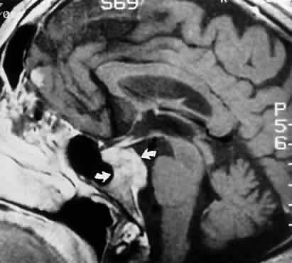Pinealomas are the most common lesion producing the “Parinaud-plus” syndrome (Fig. 36). Mass lesions involving the periaqueductal gray matter may arise in the posterior third ventricle, quadrigeminal plate (tectum), supracollicular subarachnoid space, or falco-tentorium. As the aqueduct becomes obstructed, internal hydrocephalus develops, and headache and papilledema appear. In addition to neoplasms, vascular occlusions, trauma, extra-axial and intra-axial arteriovenous malformations, demyelination, giant aneurysms of the posterior fossa, infections, trauma, stereotactic surgery for pain, and hydrocephalus from various causes have all been associated with the dorsal midbrain syndrome. Paralysis of upgaze can be an early sign of malfunctioning of a shunt placed to treat hydrocephalus, and it is reversible with repair or replacement of the shunt. Also, a reversible dorsal midbrain syndrome has been observed after jejunoileal bypass for obesity.303 CNS toxoplasmosis in AIDS patients has now become an important cause of Parinaud syndrome as well.304 A single case of Parinaud syndrome has been described in association with Leber's hereditary optic neuropathy.305 Vertical supranuclear ophthalmoplegia has been associated with metabolic disorders, including certain lipid storage diseases such as Niemann-Pick type C,306,307 which may present in adults as dementia and ataxia.308 The Niemann-Pick variant is characterized by sea-blue histiocytes in the bone marrow and visceromegaly. Ocular motor abnormalities include loss of voluntary vertical saccades, especially downward; loss of the fast phase of optokinetic nystagmus; defective convergence; and substitute “head-thrusting.” Pathologically, lipid storage has been demonstrated in numerous ocular tissues, but ophthalmologic changes are observed only in later life, when the optic nerves appear pale and the perimacular areas show gray discoloration.309 Final clinicopathologic correlation is lacking, but clinical features suggest diffuse involvement of cortical gray matter, basal ganglia, cerebellum, and upper midbrain, where corticobulbar ocular motor fibers may be preferentially involved in the subthalamic and pretectal regions. Other forms of ophthalmoplegia are present in Wilson's disease,310 kernicterus,311 and barbiturate overdose.312 |