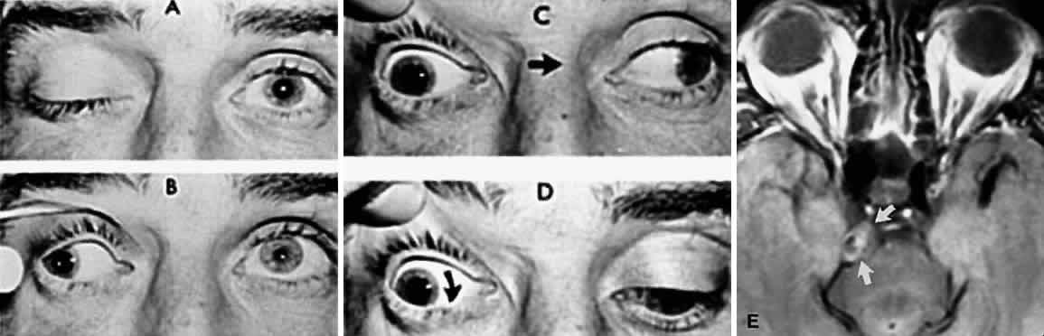 Because ocular myasthenia, and in some instances, Graves myopathy, may mimic various patterns of oculomotor nerve dysfunction, Tensilon testing and forced ductions should be considered in cases of painless ophthalmoplegia where pupils are normal. Supranuclear lesions involving midbrain structures near the third nerve nucleus may closely simulate direct damage to the nucleus. If ocular motility improves with vestibular stimulation (oculocephalic reflex, calorics) or with Bell's phenomenon, a supranuclear lesion is present. Failure of ocular motility to improve with any of these stimuli indicates the presence of a nuclear or infranuclear lesion, but does not exclude additional supranuclear abnormalities. Several clinicopathologic studies have supported Warwick's schema. There are documented instances of isolated bilateral ptosis, with discrete foci in the nuclear complex of the third nerve, in the midline at the level of the central caudal nucleus.78 Keane et al79 described a case of unilateral oculomotor palsy, complete except for near-normal levator function; at autopsy, a solitary midbrain metastasis was seen involving the rostral ipsilateral third nerve nucleus, but sparing the central caudal levator nucleus. The MRI findings in two instances of levator-sparing nuclear oculomotor palsies, with contralateral elevator palsy, defined focal rostral midbrain infarcts.80 In several patients, isolated extraocular muscle palsies (e.g., isolated inferior rectus palsy) have been ascribed on clinical grounds to small lesions of the oculomotor nuclear complex.81 Acquired bi-nuclear total ophthalmoplegia is occasionally seen (Fig. 11), as reported by Masucci.82 These findings are the result of thrombotic or embolic processes at the level of the basilar bifurcation, with occlusion of the median mesencephalic perforating arteries. Congenital bilateral total ophthalmoplegia with or without levator and pupil sparing has been reported and may be associated with dysplasia of the corpus callosum.83