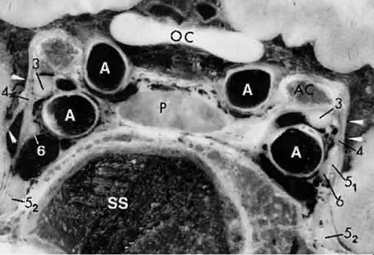 The peripheral course of the third nerve is as follows (Fig. 5): as the nerve exits ventrally from the midbrain into the interpeduncular space, it passes beneath the origin of the posterior cerebral artery and lies parallel and lateral to the posterior communicating artery. Klintworth10 pointed out that, in instances where the basilar artery bifurcates at a low level, the oculomotor nerve may be angled downward at the point where the posterior cerebral artery crosses the nerve, and vascular grooving of the superior aspect of the nerve is present in approximately one third of normal brains. The nerve runs between the free edge of the tentorium and the lateral aspect of the posterior clinoid, where it pierces the dura to enter the cavernous sinus. The oculomotor trunk occupies the superior aspect of the cavernous sinus (see ahead to Fig. 17) and separates into superior and inferior divisions at 4 to 5 mm before the superior orbital fissure. Fiber count of the superior division is about one-third that of the inferior,11 and it has been suggested that relative pupil sparing in cavernous sinus or orbital apex lesions may reflect preservation of the inferior branch. The inferior branch supplies the medial and inferior recti, inferior oblique, and parasympathetic root to the ciliary ganglion (pupil sphincter); the superior branch innervates the superior rectus and levator palpebrae. According to Kerr,12 the pupillomotor fibers are superficial in the oculomotor nerve trunk, lying just internal to the epineurium. It is thought that this superficial position makes the pupillomotor fibers especially vulnerable to compression. In more anterior segments (e.g., cavernous sinus), however, pupillomotor fibers may be preferentially spared even in the presence of total oculomotor palsy. It is likely that involvement or “sparing” of the pupil reflects the nature and acuteness of the lesion, rather than which specific segment of the oculomotor trunk is compromised. The trochlear fascicles pass dorsally, lateral to the aqueduct, and the nerve exits the midbrain and crosses the contralateral fourth nerve in the anterior medullary velum, just caudal to the inferior colliculi. The fourth nerve is the only cranial nerve to exit the brain stem dorsally. The nerve continues laterally around the midbrain tectum, crosses the superior cerebellar artery, and reaches the free edge of the tentorium, where it enters the dura and runs forward into the cavernous sinus (see Fig. 5). The fourth nerve enters the orbit through the superior orbital fissure, but above the annulus formed by the origin of the recti muscles, and innervates only the superior oblique muscle. The abducens nerve emerges from the brain stem at the lower border of the pons in the pontomedullary sulcus, approximately 1 cm from the midline. The nerve ascends the ventral face of the pons for a short distance, is crossed by the anterior inferior cerebellar artery, and pierces the dura of the clivus approximately 2 cm below the posterior clinoids (see Fig. 5). The sixth nerve traverses or passes above the inferior petrosal sinus, runs beneath the petroclinoid ligament (Gruber), and enters the cavernous sinus. The sixth nerve lies freely within the body of the cavernous sinus, unlike the oculomotor and trochlear nerves that are supported in the lateral wall of the sinus. Some sympathetic fibers are briefly attached to the abducens, passing onward to the ophthalmic trigeminal.13 From the cavernous sinus, the nerve passes through the annular segment of the superior orbital fissure and innervates only the lateral rectus. Milisavljevi According to the anatomic review by Lapresle and Lasjaunias,15 there are three arterial “systems” that vascularize the cranial nerves: the inferolateral trunk arises from the intracavernous siphon of the internal carotid artery and nourishes cranial nerves III, IV, VI, and V-1; the middle meningeal system supplies nerves VII and V-2,3; and the ascending pharyngeal system supplies nerves IX through XII. The oculomotor nerve is also vascularized by the basilar artery system in the region of the posterior perforated substance, and in the supracavernous region by the artery of the free tentorial margin (Bernasconi). The clinical correlation of ischemic cranial neuropathies with these arterial territories is not entirely clear. |