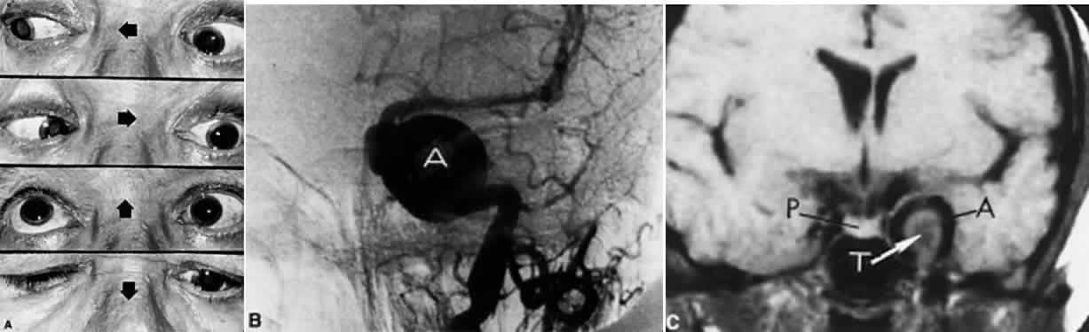 FASCICULAR LESIONS Deficits of the oculomotor fasciculus are usually identified by the accompanying brain stem signs. Oculomotor palsy with contralateral hemiplegia (Weber syndrome) indicates involvement of the corticospinal tracts. Contralateral ataxia and intention tremor (Benedikt syndrome) indicates involvement of the red nucleus (see Fig. 2). Nothnagel syndrome is an eponym given when signs of both Weber and Benedikt syndromes are present. Midbrain vascular accidents account for most fascicular defects. Ksiazek84 shed some light on the fascicular arrangement of the oculomotor nerve based on two patients with partial oculomotor paresis, each with pupillary mydriasis, significant inferior rectus paresis, and medial rectus paresis. Neuroimaging revealed a lesion in the fascicular portion of the nerve, thus indicating the proximity of these fibers in the fasciculus. Monocular elevator paresis (superior rectus and inferior oblique) in mass compression of the oculomotor fasciculus has also been reported.85 In this regard, Castro and associates86 proposed the mediolateral somatotopy of the oculomotor fascicular fibers within the mesencephalon with the inferior oblique and superior rectus muscles being most lateral, and the pupilloconstrictor fibers and inferior rectus being most medial. The levator palpebrae fascicles are in an intermediate location between the superior rectus and medial rectus fascicles. INTERPEDUNCULAR LESIONS Basal lesions, including the rare rostral basilar artery aneurysm, may encroach on the oculomotor nerves as they exit in the interpeduncular space. Such slow-growing aneurysms, either saccular or fusiform, may present as partial oculomotor palsies with or without involvement of pyramidal tracts, and without subarachnoid hemorrhage.87 Aneurysms of the posterior communicating artery, on the other hand, are probably the most common lesions causing acute spontaneous oculomotor palsies (Fig. 12). According to Hyland and Barnett,88 the oculomotor palsy that occurs with posterior communicating aneurysm is not necessarily due to mass effect per se, but rather is attributed to hemorrhage that suddenly enlarges the aneurysmal sac to which the oculomotor nerve is adherent, or to hemorrhage into the substance of the nerve itself. Most patients present, therefore, with an intensely painful, complete unilateral oculomotor palsy in association with other signs and symptoms of subarachnoid hemorrhage. Few patients with symptomatic posterior communicating aneurysms are found in office waiting rooms: they are usually obtunded or comatose in emergency rooms. Involvement of pupillary fibers is such a consistent finding in third nerve palsies due to bleeding aneurysms that most clinicians concur in this useful dictum: a pupil-sparing, but otherwise complete, third nerve palsy is very unlikely to be due to posterior communicating aneurysms. Careful pupil evaluation may disclose subtle abnormalities in “apparent pupil-sparing,” especially in cases of aberrant regeneration or with chronic cavernous sinus lesions. Generally, in patients at least 50 years of age or older, an acute, isolated, painful oculomotor palsy that spares the pupil is caused by intraneural ischemia; nevertheless, these patients must be carefully observed for further evolution. In our opinion, an acute complete oculomotor palsy with moderate to major mydriasis, even when diabetes is present, is an indication for cerebral arteriography. It should be emphasized that magnetic resonance angiography may not detect aneurysms smaller than 3 to 4 mm.89 The clinical management of patients with relative pupil-sparing third nerve palsies remains in debate. Observation alone arguably is appropriate management of such patients; however, since practically every conceivable combination of partial ophthalmoplegia and pupillary abnormality has been reported in aneurysmal compression of the third nerve, it is better to err on the side of caution and perform angiography more frequently. It is incumbent upon the physician to evaluate carefully the proportion of ophthalmoplegia and ptosis in relation to the degree of pupillary abnormality when deciding appropriate workup of these patients. Again, the increasing sensitivity of magnetic resonance angiography has not yet entirely replaced formal angiography. Certainly, neurosurgical intervention requires conventional cerebral arteriography before surgical treatment. Capó and colleagues90 pointed out that the interval from onset to maximal ophthalmoplegia does not differentiate between microvascular (3.3 days) and aneurysm (3 days), but that failure to recover within 4 to 8 weeks requires further evaluation. Other partial oculomotor palsies occur regularly with cavernous sinus masses and parasellar syndromes (see below), accompanied by variable pupillary findings. Furthermore, both acute and chronic lesions may produce incomplete palsy of the superior division (supplying levator palpebrae and superior rectus muscles) or of the inferior division (medial and inferior recti, inferior oblique and pupillomotor fibers). If pain or first trigeminal division numbness are absent, and if the pupil is uninvolved, such fractional oculomotor pareses are regularly misinterpreted as myasthenia or local orbital inflammations. Guy et al91 described five patients with isolated ptosis and elevator paresis in abduction, consistent with selective “superior division” involvement. They also discussed five previously reported cases with the following respective diagnoses: (1) intracavernous aneurysm (usually with associated Horner's syndrome) and basilar artery aneurysm; (2) diabetic ophthalmoplegia; (3) meningitis; (4) dural lymphoma; and (5) postsurgical manipulation of parasellar structures. In essence, there was little anatomic correlation with the physical separation into superior and inferior oculomotor trunks that occurs in the cavernous sinus. Moreover, two patients sustained superior division palsie