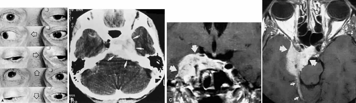 ORBITAL LESIONS Oculomotor nerve palsies with orbital lesions are usually accompanied by abducens weakness and proptosis. In the absence of proptosis, anterior cavernous sinus lesions may not be distinguishable from those involving the superior orbital fissure or orbital apex. Nonspecific inflammations of orbital tissues (orbital pseudotumor) may produce palsies of extraocular muscles in variable combinations, but other manifestations (e.g., pain, chemosis, ocular inflammation, proptosis) are usually present. Orbital trauma, unless overlooked or forgotten, usually presents no difficulty in diagnosis. Forced duction testing and orbital ultrasonography and/or enhanced CT imaging are indicated. |