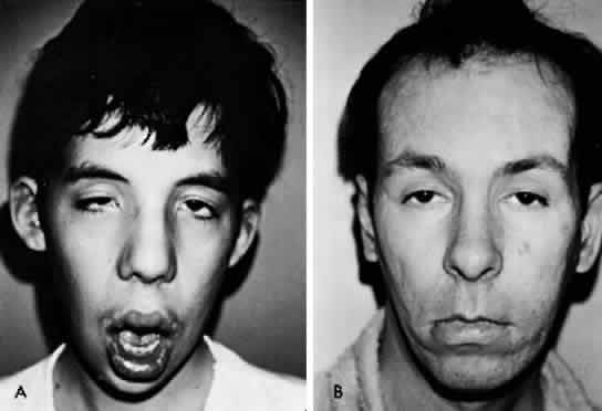 Clinically, PEO is characterized by insidiously progressive, symmetric immobility of the eyes, which are fixed to oculocephalic or caloric stimulation. There is no pain and the pupils are spared, but the lids typically are ptotic and the orbicularis oculi weak (Figs. 31 and 32). Unlike Graves' ophthalmopathy, there is no lid retraction, proptosis, or congestive conjunctival signs. In longstanding PEO, however, fibrotic changes in extraocular muscles may produce mechanical resistance and a positive forced duction test. Chronic or “fixed” ocular myasthenia may be confused with PEO, because both disorders tend to demonstrate the following: symmetric total or subtotal external ophthalmoplegia; ptosis; normal pupils; orbicularis oculi, facial, and bulbar weakness; and resistance to Tensilon or other cholinergic agents. A slowly progressive symmetric ophthalmoplegia, without fluctuations or remissions, speaks strongly in favor of PEO (see below, hereditary form). Otherwise, electrophysiologic testing and muscle biopsy may be required to distinguish between chronic myasthenia and PEO.