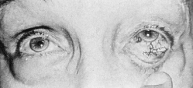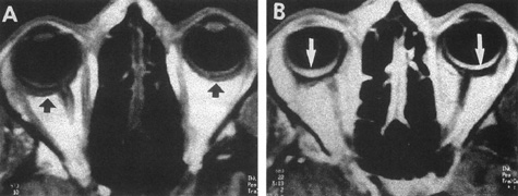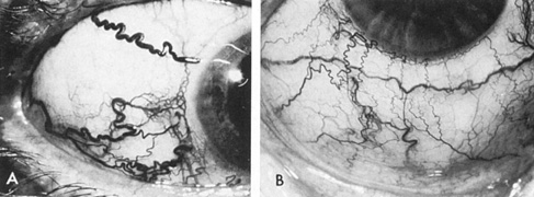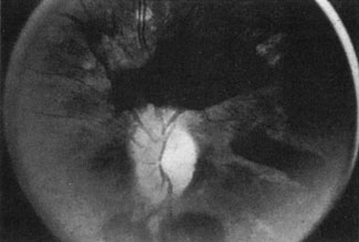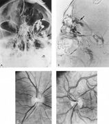 Cutaneovisceral hemangiomatosis (blue rubber bleb nevus syndrome; Bean's syndrome) is a rare congenital disorder with hallmark skin lesions (blue blebs) and gastrointestinal bleeding. The discrete venous malformations of varying size and appearance present as characteristic cutaneous lesions consisting of deep blue, soft, rubbery blebs, which are easily compressible. These malformations were described historically as cavernous hemangiomas, and inappropriately called hemangiomas. Ocular involvement includes lid blebs, iris and retinal angiomas,195 and orbital hemangiomas that may present with lid ecchymosis or intermittent proptosis,196 or intermitternt visual loss.197 VASCULAR DEFECTS RELATED TO TRAUMA The involvement of orbital veins with arteriovenous fistulas at the level of the cavernous sinus has been discussed previously. On rare occasions, shunts of the ophthalmic artery follow blunt or penetrating injury to the orbit itself. Orbital and ocular signs following such lesions are similar to those of carotid–cavernous fistulas. Internal carotid angiography shows enlargement of the ophthalmic artery and immediate opacification of either the superior or the inferior ophthalmic vein (Fig. 33). Posttraumatic arteriovenous shunts involving the intraorbital portion of the ophthalmic artery26 or its branches have traditionally been confused with primary arterial aneurysms of the orbit. The latter lesion is exceedingly rare. However, the case presented by Rubinstein and colleagues25 fulfills the angiographic criteria for acceptance. |