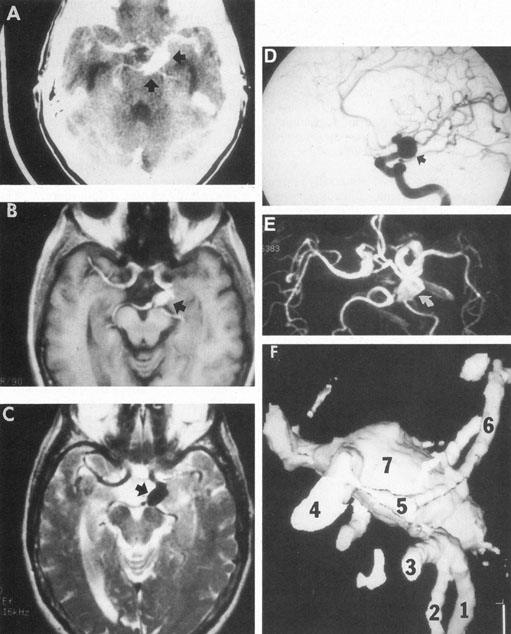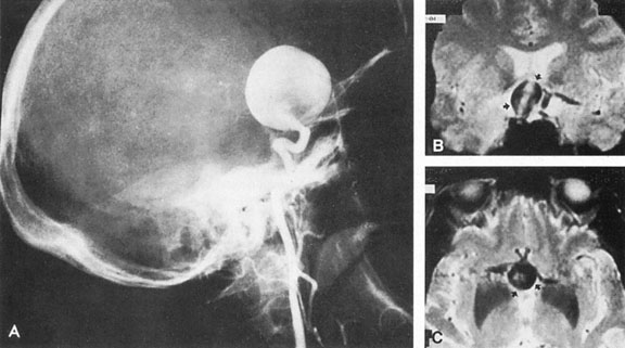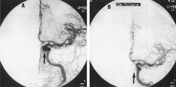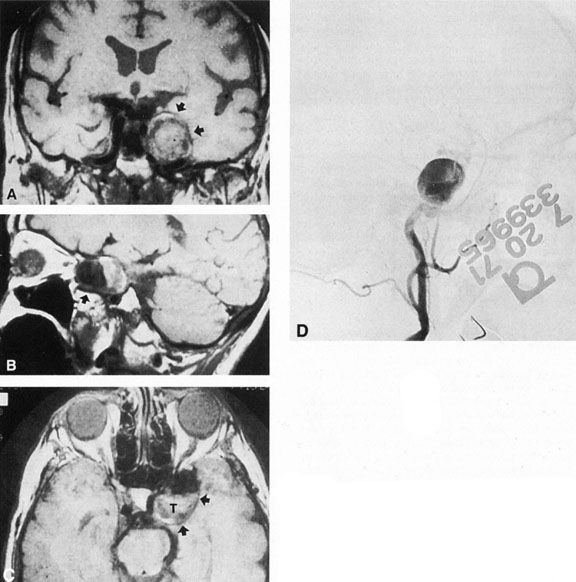 Aneurysms, either saccular or fusiform, also cause neurologic deficits by progressive enlargement rather than by rupture. For example, visual loss caused by compression of the optic nerve from fusiform distortion of the supraclinoid carotid or ophthalmic artery, or saccular enlargement of the intracavernous carotid artery that produces chronic ocular motor palsies. Symptoms in patients with aneurysmal compression of the anterior visual pathway may include visual loss that can be acute, gradual, or fluctuating. SACCULAR ANEURYSMS Intracavernous Carotid Intracavernous carotid aneurysms constitute only 2% to 3% of all intracranial aneurysms and are unique because of their location. These aneurysms arise from the internal carotid artery as it traverses the cavernous sinus4 (Fig. 3) and therefore produce a specific constellation of ocular and neurologic signs and symptoms. Rupture of such aneurysms, which are almost always saccular, may possibly result in carotid–cavernous sinus fistula, but subarachnoid hemorrhage is rare.5 However, slowly progressive enlargement is the rule, usually occurring within the cavernous sinus, with compression of the third, fourth, and sixth cranial nerves and later involving the first and second divisions of the fifth nerve (see Chapter 12).6 Progressive enlargement of the aneurysm forms a mass in the floor of the middle cranial fossa, compromising motor as well as sensory functions of the trigeminal nerve. Anterior expansion of the aneurysm erodes the anterior clinoid, optic foramen, and superior orbital fissure, eventually producing unilateral visual loss and exophthalmos. Posterior expansion, which occurs later, can erode the petrous portion of the temporal bone, causing ipsilateral facial palsy and, rarely, deafness. The sphenoidal sinus and the nasopharynx may infrequently be involved by inferior expansion and medial extension erodes into the sella and may simulate a pituitary tumor7 or cause bilateral ophthalmoplegia.8 Bilateral saccular intracavernous aneurysms occur uncommonly.9 The onset of signs and symptoms is usually insidious, at times accompanied by pain about the eye and frontal area on the involved side. The pattern of serial involvement of the cranial nerves within the cavernous sinus is usually as follows: sixth, third, fifth, and fourth. Occasionally, palsies evolve simultaneously and the ipsilateral optic nerve may eventually be encroached on by superior expansion of the aneurysm. The pupil is often not dilated maximally, as in the usual acute third-nerve palsy; it may be relatively small (rarely immobile) because of simultaneous involvement of the oculosympathetic fibers.6 Barr and associates4 believed that such aneurysms usually arise as a weakness in the lateral wall of the carotid artery within the cavernous sinus and that the aneurysm tends to expand laterally between the third and fourth nerves superiorly and the sixth nerve inferiorly, finally compressing the nerves on the medial wall of the aneurysmal sac rather than laterally. Late involvement of the fifth nerve is emphasized by the findings that, in the three studied cases, this nerve was not splayed over the lateral aspect of the aneurysm, but that it lay mainly inferior, lateral, and posterior in the region where late expansion of the aneurysm occurs. Although periocular pain has often been emphasized as a prominent symptom, it may not occur until ophthalmoplegia has been present for years. Intracavernous aneurysms are suspected by the clinical presentation of a chronic cavernous sinus syndrome and are diagnosed by enhanced computed tomography (CT), magnetic resonance imaging (MRI), and arteriography (see Fig. 3). Because of the location and configuration within the cavernous sinus, direct surgical approaches to cavernous carotid aneurysms are hazardous. In recent years intravascular occlusion of the internal carotid by detachable balloon has evolved as a safe and successful procedure, often with relief of pain and improvement in ophthalmoplegia.10 Unfortunately, these balloons are commercially unavailable at the time of this writing. Carotid–Ophthalmic Artery The carotid–ophthalmic aneurysm arises from the superior or medial surface of the carotid artery above the cavernous sinus and below the origin of the posterior communicating artery. Such aneurysms have an intimate relation to the anterior clinoid and optic nerve, which tend to cover their point of origin. They are rare in reported series: Pool and Potts11 cited only two examples in 157 cases, and there was a 5.4% incidence in 2,672 patients with single aneurysms in the Cooperative Study of Intracranial Aneurysms and Subarachnoid Hemorrhage.12 Ferguson and Drake13 reported 32 such aneurysms; Guidetti and LaTorre14 reported 16 cases. A high incidence of concurrent cerebral aneurysms has been reported: 67% in one series14 and 37.5% in another.15 There is a striking correlation between aneurysmal projection and visual impairment. With superior-medial projection, optic nerve compression with monocular visual loss is often present. Eight of 16 patients reported by Guidetti and LaTorre14 had prominent visual symptoms with reduced vision and optic atrophy. Larger aneurysms may involve both optic nerve and chiasm. However, Ferguson and Drake13 reported 32 patients with preoperative visual deficits. While involvement of the anterior visual pathway is the most frequent neuro-ophthalmologic presentation, paralysis of the third cranial nerve was reported in a single case. Although deemed a rare event,13 visual loss occurs in approximately one-third of patients with carotid–ophthalmic aneurysms.15 Aneurysms in this location may traverse the adjacent optic nerve or chiasm by actually splitting it, the mechanism of which is still unknown. Presentation with visual disturbance is again variable.16 Carotid–Supraclinoid One of the more insidious and potentially treatable causes of progressive visual loss is unruptured aneurysm of the 