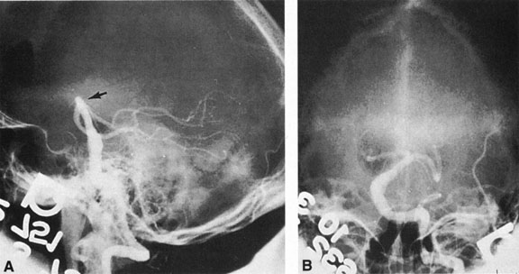 in 20% to 30% of patients.2 In addition to the common saccular (“berry”) aneurysm, the other morphologic type is fusiform, which most frequently but not exclusively involves the posterior vertebrobasilar system. Fusiform aneurysms are characterized by tortuous dilatation and elongation (dolichoectasia) of an artery and are usually associated with atherosclerosis, hence the synonymous term atherosclerotic aneurysm. The intracranial arteries have thin media and poorly developed or absent internal elastic lamina; they are particularly prone to develop small outpouchings at arterial branch junctions where developmental defects in the media exist. Histologic study of the saccular aneurysm often demonstrates a defect in the elastic and muscular coat, beginning at the point of origin (neck) from the parent artery. This finding has supported the concept of a developmental origin and created the term congenital aneurysm to designate saccular aneurysms, although these lesions are not present at birth. Factors such as hypertension, degenerative changes in the arterial wall, and heritable connective-tissue disorders as in the Ehlers-Danlos syndrome and neurofibromatosis-1, all play roles in the subsequent development of aneurysms. There is firm evidence of aneurysm disease in first- or second-degree relatives, and there is a distinct association with polycystic kidney disease and aortic coarctation.2 As noted, multiple saccular aneurysms of the carotid or vertebrobasilar system occur 20% to 30% of the time, frequently with identical or mirror sites found in the left-sided and right-sided circulations. Most aneurysms arise from the carotid system on the anterior communicating, middle cerebral, and internal carotid arteries, or they arise in the region of the origins of the posterior communicating arteries (Fig. 1A). Only some 5% of saccular aneurysms arise on the vertebrobasilar system (Fig. 1B). Usually, clinical symptoms are the result of rupture of an aneurysm, resulting in extravasation of blood under arterial pressure into the subarachnoid or intraventricular spaces or into the brain parenchyma, with intracerebral hematoma formation. Subarachnoid and intraventricular blood causes depression of consciousness; intracerebral hematoma and vascular spasm produce focal neurologic signs and even cerebral herniation with compression of the third nerve. The subsequent sudden increase in the intracranial pressure may result in sixth-nerve palsies, in subretinal, intraretinal, or preretinal hemorrhage, and in conjunctival and, rarely, orbital hemorrhage. Approximately 100 years ago, Terson recorded the occurrence of vitreous hemorrhage after spontaneous subarachnoid bleeding. Such ocular hemorrhage is believed to result from transmission of intracranial pressure through the subarachnoid communication between the optic nerve sheath and the intracranial cavity, with subsequent nerve sheath dilation and rupture of dural and bridging vessels (Fig. 2). Intraocular hemorrhage is possibly the result of retinal venous hypertension brought on by obstruction of both the central retinal vein and the retinochoroidal anastomoses. Kuhn et al3 have reviewed Terson's syndrome, including the role of pars plana vitrectomy; these authors noted the high incidence of preceding coma, and the efficacy of surgical intervention in visual recovery.