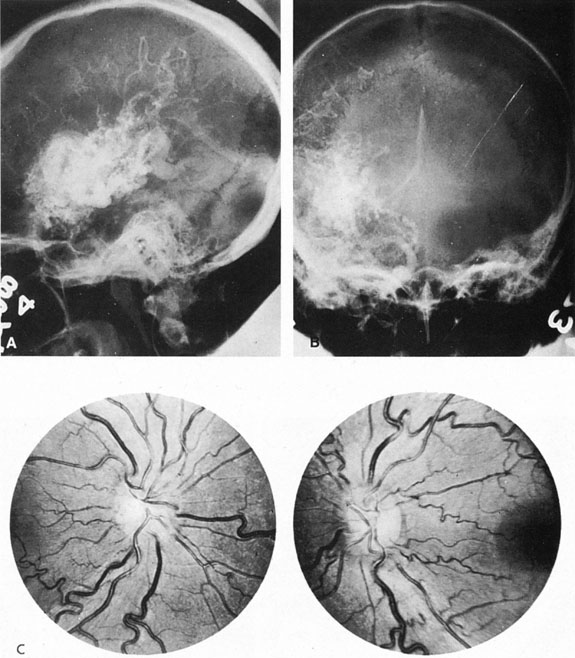 proton spectroscopy has allowed more thorough and accurate diagnosis.162,163 RETINOCEREBELLAR ANGIOMATOSIS (VON HIPPEL-LINDAU DISEASE) After von Hippel's description of angiomatosis retinae, Lindau synthesized the clinical entity, which includes angiomas of the retina, brain, spinal cord, and viscera. While the retinal lesion may be the clue that identifies the disease (and causes loss of vision), it is the cerebellar hemangioblastoma (cystic or solid) that potentially dooms the patient.163 The disorder is inherited, in the majority of instances, in an autosomal dominant pattern with variable and incomplete penetrance, the gene mapped on the short arm of Cr3. DNA extracted from blood may be analyzed for a 3-base pair deletion of the VHL gene, thereby identifying Von Hippel-Lindau (VHL) disease gene carriers.164 The penetrance of this disease is age- and tumor-dependent, with most patients presenting in the second and third decades. When angiomatous lesions become symptomatic, a careful family history is mandatory, and examination of first- and second-degree relatives is ideal. Symptoms are usually related to the retinal or cerebellar lesions, but spinal cord hemangioblastomas occur, and other visceral hamartomas should be sought; these include the following: pancreatic, lung, epididymal, and renal cysts; renal cell carcinoma; pheochromocytoma; and multiple visceral angiomas.163 Indeed, the lifetime risk for renal clear cell carcinoma amounts to 70% and is the most frequent cause of death. Pheochromocytomas affect 7% to 20% of reported patients and can be bilateral and malignant. The retinal lesions (von Hippel tumor) may take the form of a fully developed elevated angioma in the midperiphery (Fig. 23), an incipient small nodule, or of minuscule anomalies on the disk.165 Hemangioblatoma of the optic nerve is reported, associated with cerebellar and visceral cysts.166 Most central nervous system lesions are found in the cerebellum, spinal cord, and brainstem; there is special predilection for the craniocervical junction and conus medullaris. Supratentorial lesions are rare, but chiasmal hemagioblastomas are documented.167 The larger retinal lesions are characterized by single enlarged and tortuous retinal arterial afferents and similarly dilated venous efferents. Yellowish retinal and subretinal exudate is seen, somewhat mimicking the exudative retinopathy of Coats retinal telangiectasia. Macular exudate or retinal detachment accounts for visual symptoms and may progress to proliferative retinopathy and secondary glaucoma. Multiple angiomas may occur in the same or contralateral eye. Indirect ophthalmoscopy and fluorescein angiography are exceedingly helpful in discovering small or incipient lesions. It is impossible to predict which patients with retinal angiomas harbor coexisting cerebellar lesions or other systemic harmartomas. In extensive and excellent reviews,163,170 the average age at onset of symptoms, whether ocular or neurologic, occurs in the 20- to 30-year age group, but definitely younger than 50 years of age. The cerebellar lesions present as chronic posterior fossa masses, with signs and symptoms of chronic headaches, vertigo, vomiting, and ataxia. In addition, 10% to 20% of cerebellar hemangioblastomas are associated with polycythemia. If polycythemia does not diminish following resection of the cerebellar lesion, it is likely that the mural nodule (Lindau tumor) was overlooked or that the patient harbors a renal cell carcinoma or pheochromocytoma.168 Neurodiagnostic studies in the presence of a cerebellar mass may be expected to show dilation of the ventricular system and signs of posterior fossa mass. These lesions, especially when small, are amenable to surgery, and therefore the prognosis is good. Rapid and durable recovery of visual function may follow systemic therapy with vascular endothelial growth factor receptor inhibitor su5416.169 Once the retinal angioma is diagnosed, all efforts should be directed to uncover the possibility of a cerebellar lesion and occult renal cell carcinoma. The Cambridge screening protocol,163,170outlined by Maher, recommends the following: annual physical examination and urinalysis; annual indirect ophthalmoscopy, with fluorescein angiography; MRI of the brain every 3 years to age 50 years, and every 5 years thereafter; annual renal ultrasound, with CT every 3 years; annual 24-hour urine collection for vanillylmandelic acids. ENCEPHALOTRIGEMINAL ANGIOMATOSIS (STURGE-WEBER SYNDROME) Among the most striking of the neurocutaneous vascular syndromes is that which includes facial hemangiomas, for which reason perhaps a more useful name would be meningooculofacial angiomatosis. In its complete form, the disorder is characterized by the following: (i) port wine angioma (nevus flammeus) of the face, commonly involving the distribution of the ophthalmic division of cranial nerve V (Fig. 24), but not limited to it; (ii) seizure disorder beginning in early life; (iii) gyriform cortical calcifications associated with leptomeningeal angiomatosis; (iv) homolateral buphthalmos or glaucoma, especially when the nevus extends to the lid; and (v) intellectual retardation in about 30%. In addition, hemiplegia or hemianopia may be seen contralateral to the cerebral lesion. Familial occurrence is unsubstantiated. Angiomatosis may occasionally involve the choroid plexus, thyroid, pituitary, lungs, gastrointestinal tract, pancreas, ovaries, and thymus. The Sturge-Weber syndrome is relatively rare, with a frequency of 1 per 50,000, and likely occurs as a result of embryologic malformation of vasculature affecting skin, eye, and brain. In a series of 51 patients seen at the Hospital for Sick Children, Toronto,171 71% had glaucoma, 69% had conjunctival or episcleral hemangiomas, and 55% had choroidal hemangiomas, almost half of which were bilateral. Choroidal hemangiomas may diffusely involve the entire uvea, or the hemangioma may be more localized (Fig. 25). For 