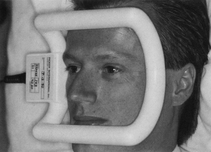 MAGNETIC RESONANCE IMAGING UNITS The largest component of an MRI unit is the magnet, which has a central internal bore into which patients are placed. Superconductive magnets are the most common type of magnet used for medical imaging to generate a uniform magnetic field of sufficient strength. They are cooled by liquid helium and nitrogen to reduce electrical resistance, and most operate between 0.5 and 3 tesla (T). (The tesla is a unit of magnetic field strength. One tesla is approximately 16,000 times greater in magnitude than the earth's magnetic field.29) Although clinical images can be obtained with much weaker magnets (e.g., 0.2 T), the image quality increases and acquisition time shortens with greater field strengths. Also, spectroscopy and imaging of elements other than hydrogen require high-magnitude magnetic fields.5,15,29,30 Gradient coils are located within the bore of the magnet, and transmitter/receiver RF coils are positioned within the gradient coils. The remainder of the MRI unit is set up similarly to a CT scanner. Patient-handling equipment and gantry are found in the room containing the magnet, and a separate room houses the diagnostic stations and the control panel for the operator. Computers are linked to the system for image reconstruction, analysis, display, and storage.15 SURFACE COILS Surface coils are RF receiver coils that are exclusively designed for specific areas of study. The smallest diameter coil possible is chosen for the selected region to be imaged and is placed close to that surface in order to reduce the transmission of signals emitted from surrounding tissues not of interest. The SNR from the area of study thus is effectively increased, allowing thinner slices and improved spatial resolution. The primary advantage of a surface coil is improved SNR; the primary disadvantages are limited depth of view and varying signal intensity over the field of view.5,6,8,16,30,31 An orbital coil (Fig. 11) or head coil may also be chosen for high-resolution orbital imaging.