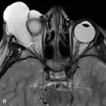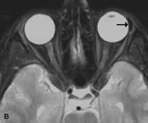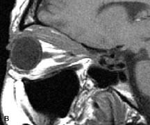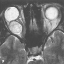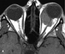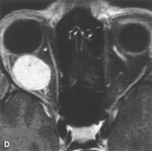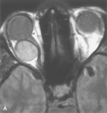 PATIENT PREPARATION Before MRI is performed, patients must be screened and prepared to avoid the potential hazards associated with the strong magnetic field. Patients who have ferrous aneurysm clips or cardiac pacemakers, who depend on life-support equipment, or who retain a possible metallic intraocular foreign body are not candidates for this imaging modality. MRI cannot be performed on obese patients who cannot fit into the bore of the magnet. Patients who are claustrophobic may not tolerate a prolonged period of study within the confines of the magnet, whereas others might do well if given a mild sedative. All worn metallic objects (e.g., necklaces, watches) should be taken off, credit cards set aside, and eye makeup removed before entering the room containing the magnet.5,20,34,35,36 NORMAL ORBITAL ANATOMY T1-weighted images provide the best anatomic details of the orbit because they display superior contrast resolution between normal structures (see Fig. 8). The vitreous has a long T1, resulting in an intermediate signal similar to brain, whereas the crystalline lens and sclera appear dark because of a longer T1 and short T2. The extraocular muscles, like all skeletal muscles, demonstrate a moderately long T1 and short T2 and highly contrast with the intense signal of the surrounding orbital fat (adipose tissue has an extremely short T1). The lacrimal glands appear as mottled areas of reduced intensity of the signal from the orbital fat in the lacrimal fossa. The optic nerves are seen with the same signal intensity as brain white matter and are hypointense relative to the orbital fat because their Tl is longer than the Tl of fat but shorter than the Tl of water. Cortical bone is not well delineated because it contains little free water, yielding minimal signal in MRI, and thus appears dark on all pulse sequences. This feature explains why MR images of the orbital apex and intracanalicular portion of the optic nerves are superior to comparable CT scans. Partial volume averaging of the bones in these regions obscures soft tissue details on CT images, whereas MRI reveals the signals only from the soft tissue structures with no cortical bone input. Bone marrow, on the other hand, is seen as a relatively intense signal because of its high fat content (see Fig. 8).37,38 T2-weighted pulse sequences are not ideal for imaging normal anatomy; however, they are particularly useful in revealing pathologic conditions (see Fig. 9). T2-weighted studies are most easily recognized by a bright vitreous signal. ORBITAL DISEASES Vascular Lesions Cavernous hemangiomas appear as well-circumscribed, smooth, usually intraconal masses that are isointense to muscle on T1-weighted images and hyperintense on T2-weighted images (Fig. 12). Patchy early enhancement is typically followed by diffuse, more homogeneous enhancement.39 The internal architecture of the mass, including septation and internal vasculature, may often be appreciated with high-quality orbital imaging.40 Lymphangiomas consist of ectatic vascular channels within a connective tissue stoma with varying degrees of lymphoid cellularity. On MRI, these tumors are typically poorly circumscribed, multicompartmental, and heterogeneous, often showing cystic dilations with fluid levels (Fig. 13). The signal characteristics within lymphangiomas vary considerably, reflecting cystic and solid components and the varying paramagnetic characteristics of blood at different stages of degradation.40–42 Acute hemorrhage appears hypointense on both T1- and T2-weighted formats. Methemoglobin present in subacute hemorrhage (3 to 14 days) leads to hyperintense signal on both T1- and T2-weighted images.41 A small percentage of lymphangiomas appear radiologically indistinct from orbital cavernous hemangiomas.43 Orbital varices are venous malformations that expand with increased systemic venous pressure, such as with Valsalva maneuvers. Because rapid acquisition of images during a Valsalva maneuver is important in imaging such a lesion, conventional or spiral CT is currently the modality of choice.44 MRI is an excellent modality for demonstrating enlargement of the cavernous sinus and dilation of the superior ophthalmic vein in patients with high-flow carotid-cavernous fistulas (Fig. 14).37MRA may be helpful in the evaluation of the venous outflow pattern. The rapidly flowing blood in these vascular structures carries the excited protons out of the section before they can be imaged, resulting in their dark appearance.5 In low-flow dural arteriovenous malformations, MRA may help define the arterial feeding vessels.45 Neural Lesions MRI is more effective than CT in delineating the intracranial optic nerves, chiasm, and optic tracts and, for this reason, is the preferred imaging modality in the evaluation of optic nerve disorders. The spatial relationships and image contrast of the orbital tissues with intraorbital optic nerve tumors is comparable between the two imaging modalities. The normal nerve is isointense to brain and appears enlarged and kinked owing to infiltration of an optic nerve glioma on T1-weighted images. Gliomas appear hyperintense on T2-weighted images and may be heterogeneous owing to cystic areas within the tumor. Contrast enhancement is variable.46 Intraorbital and intracranial optic nerve sheath meningiomas are usually isointense to cortical gray matter on Tl-weighted images and remain isointense on proton density studies (Fig. 15). Gd-DTPA is useful in delineating the intracranial extension of optic nerve meningiomas.7,47 The hyperostosis of bone and calcification associated with meningiomas are not demonstrated as well on MRI studies as on CT scans.20,37 Gd-DTPA–enhanced MRI also appears promising in the study of the permeability of the blood–brain barrier in selected optic neuropathies.22,48 MRI may reveal an enlarged optic nerve and some degree of contrast enhancement in cases of optic neuritis.49 Muscle Disorders Extraocular muscle enlargem