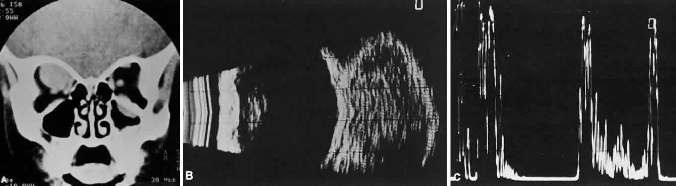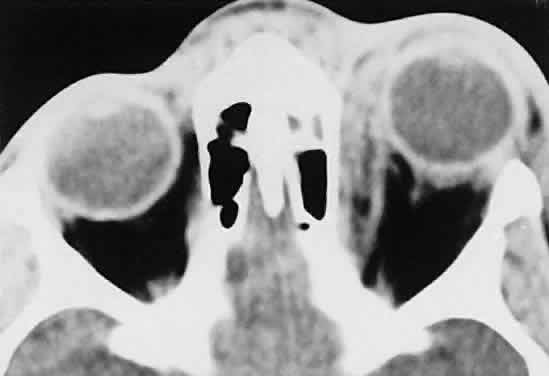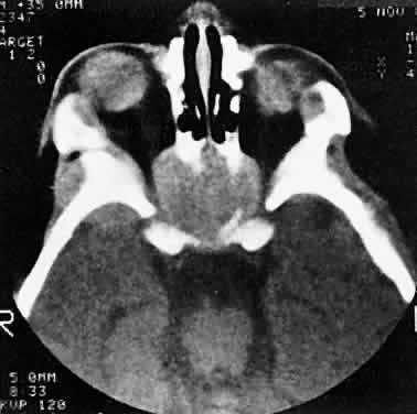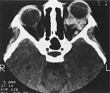 The general management of these disorders varies widely. In most of the malignant conditions, a prompt tissue diagnosis is followed by systemic evaluation and definitive multimodal therapy by a team skilled in pediatric oncology. In these cases, the preferred surgical approach for the biopsy may vary with the suspected tumor. For a lymphangioma with recent hemorrhage, the diagnosis might be established on clinical grounds and the patient observed, or intervention might be restricted to simple evacuation of blood cysts without attempts at major resection. For a dermoid cyst, complete excision without violation of the tumor capsule is the goal. For a capillary hemangioma, the clinical diagnosis generally is followed by simple observation without surgical intervention. In inflammatory processes, the diagnosis also is based on clinical evidence, and anti-inflammatory measures are initiated. Distinctions between infectious and idiopathic inflammations are necessary in choosing the appropriate medications. Although these conditions are addressed individually elsewhere in this text, they are presented briefly and in juxtaposition here, because it is apparent that some informed distinctions must be made promptly at the time of initial presentation. Although we briefly discuss treatment, the emphasis of this chapter is on the features that might lead to a provisional diagnosis. There are marked differences in the frequency of these disorders,1 but they do not reflect the clinical importance of any individual lesion. Statistical frequencies are also of less value in the diagnosis of any individual case than are careful analysis of the history, physical findings, imaging tests, and histopathologic samples. Computed tomography (CT) remains the first-line diagnostic test in most cases of proptosis. The topographic features shown by CT should narrow the differential diagnosis. Magnetic resonance imaging (MRI) can provide additional diagnostic information by exploiting different physical properties of the lesion compared with CT. For example, lesions that are isodense with normal structures by CT may not be isointense by MRI. In selected cases, orbital echography may further reduce the diagnostic choices by providing information about the lesion's internal architecture. |