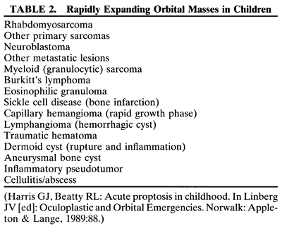 benign in every sense. The full differential diagnosis of pediatric proptosis is a broad one, although the causes are relatively distinct from those in adults (Table 1). The list of conditions that may produce sudden or rapidly progressive proptosis is considerably shorter, but a diverse group of disorders must still be considered in this clinical setting (Table 2). Some of these conditions originate in and are restricted to the orbit. They may result from disordered embryogenesis and development, or they may arise as primary neoplasms. In the pediatric population, tumors that metastasize from distant primary sites preferentially lodge within the orbit rather than within the globe, a reversal of the tendency noted in adults. Proptosis also may result from orbital involvement by systemic conditions such as leukemia and the histiocytoses. Orbital manifestations of these disorders may be the presenting clinical signs. Finally, orbital inflammatory conditions can simulate true neoplasia and may have to be considered in the differential diagnosis in individual cases.