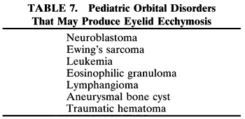 Although no single regimen is appropriate for every child with orbital rhabdomyosarcoma, a sample protocol might include multiple 3-week cycles of chemotherapy, each beginning with intravenous vincristine, actinomycin-D and cyclophosphamide, with vincristine repeated on the eighth and fifteenth days of each cycle. The regimen might include external radiation to a total dosage of 5040 cGy. For poor prognosis cases (e.g., metastatic alveolar rhabdomyosarcoma), newer agents under investigation include ifosfamide, etoposide, and topotecan.2 Having made the diagnosis and contributed to local staging at the time of presentation, the orbital surgeon continues to follow the patient along with the pediatric oncology team. In cases of treatment failure, “salvage” surgery may take the form of orbital exenteration8 or excision of residual tumor combined with brachytherapy.9 Rhabdomyosarcoma underscores the importance of clinical suspicion when dealing with acute proptosis in childhood. Prompt referral to a tertiary center after appropriate imaging is the responsibility of the primary ophthalmologist, family practitioner, or pediatrician who may first encounter the patient. OTHER PRIMARY SARCOMAS Other primary orbital sarcomas may have a relatively abrupt onset of proptosis, although their progression generally is less explosive than that of rhabdomyosarcoma. As with rhabdomyosarcoma, a prompt biopsy is critical for appropriate management. Alveolar soft part sarcoma, an example of this group of lesions, is a rare tumor that may affect the pediatric orbit. In an extensive review of the literature, Sullivan and colleagues10 identified about 50 orbital cases. They noted that the tumor tends to involve the extremities of young adults or the head and neck region of children, with a predilection for the orbit and tongue. A myogenic origin is favored, but there also is evidence for a neural derivation. The findings of imaging studies are nonspecific. Diagnosis depends on the light and elec-tron microscopic demonstration of periodic acid-Schiff-positive, diastase-resistant crystals within the cytoplasm of large polyhedral tumor cells.11 Pediatric patients appear to have a better prognosis than do adults. The currently recommended treatment is local excision of circumscribed primary lesions, with exenteration reserved for diffuse orbital involvement or local recurrence. Radiation therapy may have adjunctive value. Epithelioid sarcoma is a rare tumor that can occur in older children and young adults. Most lesions originate in the distal upper extremities. White and coworkers12 identified two patients; one was a 17-year-old girl with primary epithelioid sarcoma of the orbit. The tumors have both mesenchymal and epithelial histologic qualities and grow in tendon sheaths in a grossly nodular pattern. Treatment strategies have yet to be defined for this rare lesion. NEUROBLASTOMA Neuroblastoma is the most common metastatic orbital lesion in children.13 It represents 10% to 15% of all pediatric malignancies, ranking behind only leukemia and solid central nervous system tumors in frequency. It is a tumor of primitive neuroblastic tissue and, in some respects, is the autonomic nervous system counterpart of retinoblastoma. It usually originates in the adrenal medulla or other retroperitoneal sites but also may arise from any of the sympathetic ganglia in the mediastinum or neck. Neuroblastoma typically afflicts children from 18 months to 3 years of age, although it may be present at birth or may not appear until the midteens. In a review of more than 400 cases of neuroblastoma, Musarella and colleagues14 found the incidence of ophthalmologic signs to be 20%. In almost half of these cases, the ocular symptoms were the presenting complaints. The most common eye signs were related to orbital metastasis. Orbital involvement was bilateral in approximately half of the cases. Characteristic eye findings include proptosis and periorbital ecchymosis. The latter results from hemorrhagic necrosis within a rapidly growing tumor that has outstripped its blood supply. Other eye signs may reflect more distant tumor involvement. Horner's syndrome can result from a primary neuroblastoma in the sympathetic ganglia of the neck or mediastinum or from metastases to either of these regions.13–15 An infantile Horner's syndrome is characterized by hypochromia of the ipsilateral iris. Ocular signs may include opsoclonus, a wild conjugate oscillation of both eyes that may be associated with myoclonus, and truncal ataxia.14 It has been proposed that this complex results from an antibody directed against neuroblastoma antigen, which may cross-react with cerebellar tissue, producing damage in that area.16 Neuroblastomas manufacture catecholamines, which, in sufficient quantity, can produce flushing, systemic hypertension, and diarrhea. Diagnosis is aided by the demonstration of catecholamine metabolites in the urine.17 In cases of suspected neuroblastoma metastatic to the orbit, the primary tumor may be shown by abdominal or thoracic imaging studies. A histologic diagnosis generally is required, however. Orbital soft tissue involvement usually follows extension from bony metastasis (Fig. 3). Therefore, orbital biopsies should be performed extraperiosteally, because the periorbita may still be intact and constitute a relative barrier to tumor extension. Because the histologic differential diagnosis includes other poorly differentiated tumors of childhood, speci-mens should be fixed in both formalin and glutaraldehyde, and fresh tissue also should be submitted. Histologically, neuroblastomas display features commensurate with their degree of differentiation. At the more primitive end of the spectrum are tumors comprising small round cells with minimal cytoplasm. At the other extreme are lesions consisting of large, cytoplasm-rich elements resembling ganglion cells. It has been proposed that neuroblastomas having undergone spontaneous clinical