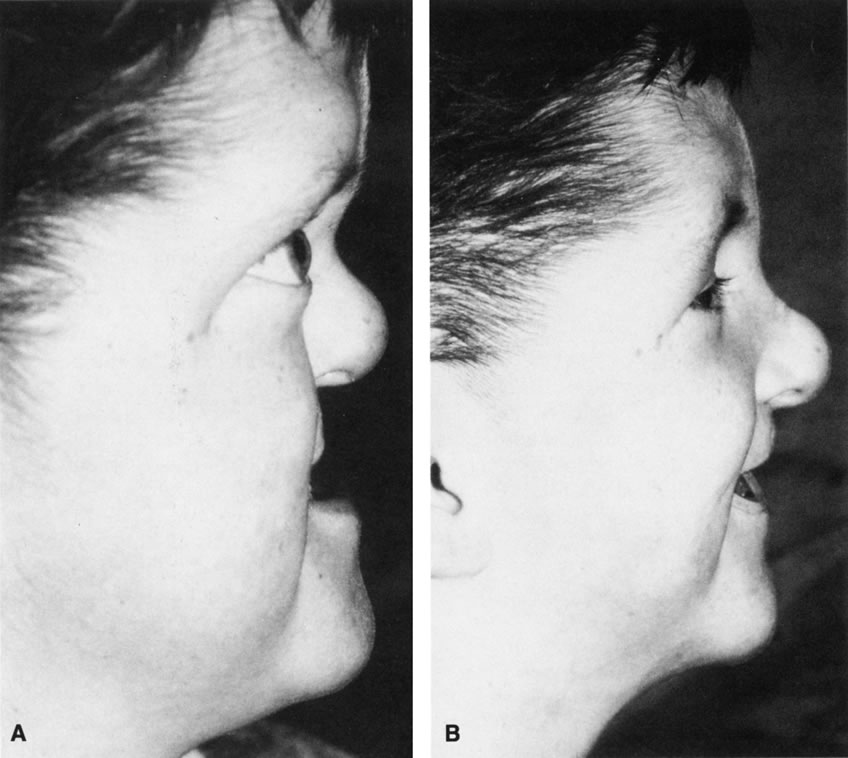 | Mandibulofacial dysostosis (Treacher Collins syndrome, Franceschetti syndrome) is a bilateral, autosomal dominant condition that results from abnormal development of structures derived from the first and second branchial arches (Fig. 16). The genetic defect for Treacher Collins syndrome, TCOF1, has been isolated to chromosome 5, and the gene product, treacle, has been identified as a nucleolar protein.17,18 The exact function of treacle, however, has not yet been determined. The craniofacial anomalies include hypoplasia of the maxilla, mandible, and zygoma associated with a variety of soft tissue malformations. These malformations include underdevelopment of the midfacial musculature, lower eyelid colobomas, inferior displacement of the lateral canthi (antimongoloid slant), inferior punctal agenesis, and blepharoptosis. Additional ocular anomalies may include high myopia, dermolipoma, lens subluxation, and secondary glaucoma.19 |