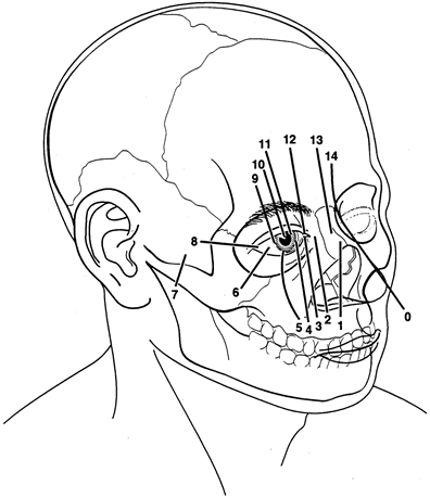 Tessier cleft 0-14, a true median cleft, is associated with orbital hypertelorism and meningoencephalocele (Fig. 13). Clefts 1 and 2 are associated with telecanthus from involvement of the soft tissues of the medial canthus but spare the lacrimal system and eyelids. Clefts 3 and 4 involve the inferomedial orbit and lower eyelid medial to the punctum. Disruption of the nasolacrimal system is associated with bony defects between the orbit, maxillary sinus, and nasal cavities, with inferior displacement of the globe.14 Cleft 5 is associated with a defect in the inferolateral orbital rim and floor, a lateral lower eyelid cleft, and frequently microphthalmia. Features of clefts 6, 7, and 8 are seen in Treacher Collins syndrome, Goldenhar's syndrome, and hemifacial microsomia. Ocular abnormalities may include a cleft or antimongoloid slant of the lateral lower eyelid, hypoplasia of the maxilla with downward slanting of the lateral orbital floor, and hypoplasia or absence of the lateral orbital wall. Cleft 9 is characterized by defects in the superolateral orbital rim and the lateral one-third of the upper eyelid, and distortion of the lateral canthus. A central cleft of the eyebrow, upper eyelid, supraorbital rim, and orbital roof characterize cleft 10. Fronto-orbital meningoencephaloceles are common (Fig. 14). Cleft 11 is characterized by defects in the medial aspect of the upper eyelid and brow, but no bony defect in the supraorbital rim. Cleft 12 is associated with telecanthus, hypertelorism, and a defect at the medial root of the eyebrow. Clefts 13 and 14 are characterized by hypertelorism with sparing of the orbital soft tissues.