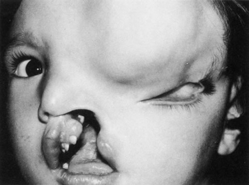 Fibrous dysplasia is not a true neoplasm; however, there is a small incidence of malignant degeneration, usually into osteogenic sarcoma. Treatment options range from careful observation to aggressive debulking of the diseased bone, with subsequent reconstruction. Recent advances in craniofacial surgery, including cranial bone grafting with mini- and microplate fixation, have made the latter approach more appealing. ANENCEPHALY Anencephaly, either partial or total absence of the brain, is a severe congenital birth defect incompatible with life. This dramatic deformity results from a failure of forebrain development. The vault of the skull is absent, and the forebrain consists of a degenerated mass of glial tissue. The orbits are shallow and tilted upward. The eyes are fairly well developed, but the optic nerves, when present, taper down to a loose mass of glial tissue at the optic canal. CYCLOPIA/SYNOPHTHALMOS True cyclopia is a rare congenital anomaly characterized by a single eye situated in a single median orbit. Synophthalmos, which is also rare but much more common than true cyclopia, occurs when paired ocular structures are found in a single median orbit (Fig. 19). These disorders result from a failure of lateralization of the midline facial structures. |