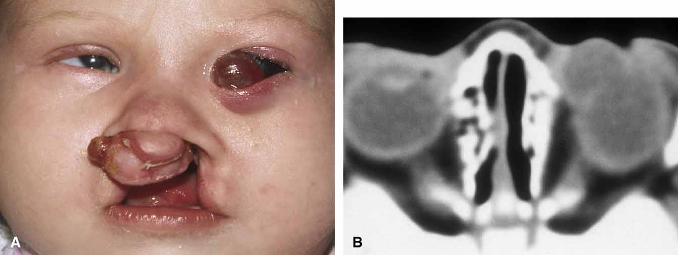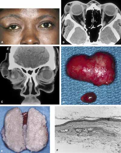 the meningeal sac, the term encephalocele or meningoencephalocele applies. These cephaloceles are rare. Their diagnosis most often is made in infancy, although a cephalocele presenting deep in the orbit may not be recognized until later in life.21 Cephaloceles form during embryonic development and their formation is either the result of the failure of the neuroectoderm to separate from the surface ectoderm or to defects in osseous development when fetal fissures fail to close. In the former instance, brain tissue is pinched off by the developing bony cranium, the result being a cephalocele attached to the brain by a tissue stalk that extends through sutures between the frontal, ethmoid, lacrimal, and/or maxillary bones. In the latter instance, defects in osseous development result in true herniation of intracranial contents.22 An encephalocele most commonly presents as an anterior protrusion between the nose and eyebrow or as a lateral protrusion into the orbit (Fig. 6). Painless and elastic, the encephalocele may enlarge slowly, and pulsations may be present. The larger the defect, the greater the degree of pulsation and often, the more rapid the increase in size. A Valsalva maneuver or crying can cause a mild increase in size. Orbital signs are limited to the mass effect. Globe displacement or proptosis occurs and is related to the location and size of the cephalocele.23,24 When protruding from the nose into the lower lid, a cephalocele may resemble, and be confused with, a mucocele of the nasolacrimal sac or with a dacryocele. The diagnosis of an encephalocele should be considered in any child with a midline or paramedian cystic tumor. Facial anomalies such as hypertelorism, broad nasal root, or increased bitemporal diameter should alert the clinician to the possibility of an encephalocoele. Radiographic analysis by CT or magnetic resonance imaging (MRI) is critical, both to the diagnosis and to the management of cephaloceles. Recognition of these cysts permits appropriate management rather than an accidental surgical encounter. Surgical treatment is indicated, consisting of exposure, ligation, and excision of a small encephalocele, and of transfrontal craniotomy with excision of a larger encephalocele followed by dural patching, and possibly by bone grafting if the bone defect is large. |