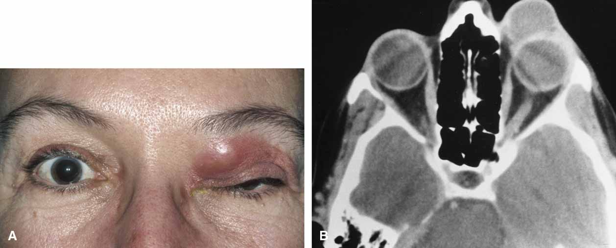 previous sinus surgery. Mucoceles of the frontal and ethmoid sinuses are most common; and their clinical features are usually related to a mass effect and inflammation.33–34 The enlargement of the mucocele may be insidious, with proptosis and displacement of the globe being manifest in association with a palpable, smooth-walled mass in the upper inner quadrant of the orbit (Fig. 8). Mucoceles of the posterior orbit may present more insidiously, with the patient having vague complaints of headache and orbital discomfort. These mucoceles arise in the sphenoid sinus and posterior ethmoid air cells and may mimic retrobulbar neuritis or cause ophthalmoplegia and ptosis by affecting branches of cranial nerve III. Axial proptosis is observed, in contrast to the global displacement in the horizontal or vertical plane associated with anterior mucocele of the frontal sinus. Radiographic analysis, including CT, serves to delineate the origin and extent of the mucocele. Thinning of the overlying bone because of progressive expansion of the mucocele is apparent. Intracranial extension can be observed in untreated mucocele. The treatment of mucoceles is surgical. Frontal and frontoethmoidal mucoceles are often approached subperiosteally with elevation of an osteoplastic flap and eradication and extirpation of all diseased mucosa. Successful sinus obliteration and/or reestablishing sinus drainage intranasally protect against recurrence. Sphenoid sinus mucoceles are approached intranasally. Neurosurgical consultation is indicated for those mucoceles with intracranial extension. |