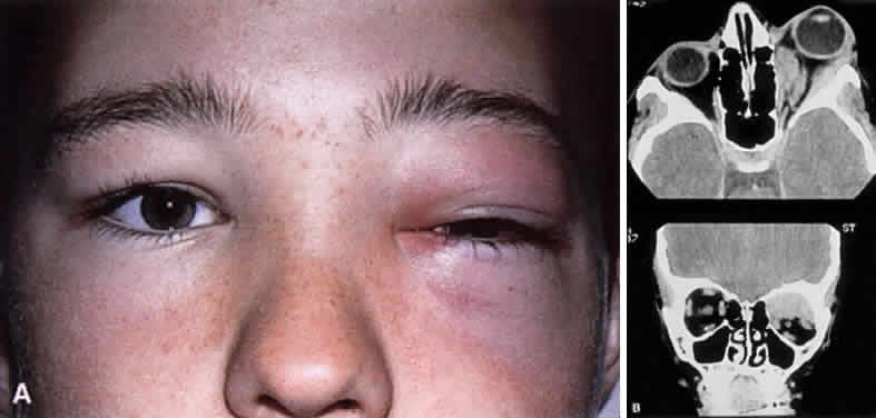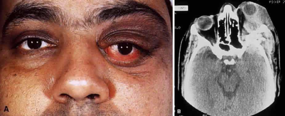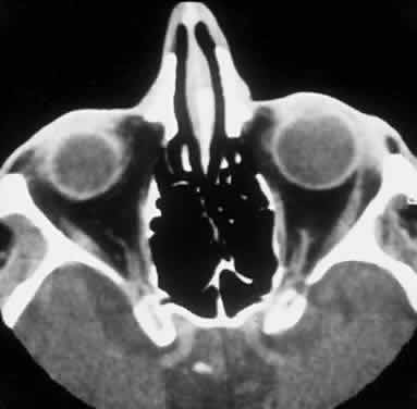 ORBITAL LEUKEMIA The eyes and adnexa are sites of metastasis in 80% of systemic leukemias.155–158 The acute myelogenous leukemias are more likely to involve the orbit than chronic or lymphocytic leukemia159–160 (Fig. 23). Bilateral proptosis caused by leukemic infiltration is seen in approximately 2% of cases and may present with intralesional hemorrhage in the case of granulocytic leukemia.161–163 Differential diagnosis of rapid-onset proptosis with hemorrhage in the pediatric population also includes rhabdomyosarcoma, metastatic neuroblastoma, Ewing's sarcoma, orbital cellulitis, and cavernous sinus thrombosis. Although rare in children, orbital lymphoma also must be excluded. GRANULOCYTIC SARCOMA Granulocytic sarcoma, also known as chloroma, is an isolated tumor consisting of myeloid leukemic cells in the soft tissue or bone of the orbit in the absence of peripheral blood or bone marrow involvement164 (Fig. 24). In a series of 33 patients, chloroma occurred at a mean age of 7 years with a male-to-female preponderance of 3:2 and was more common in Africans and Asians.165 Early diagnosis is critical because treatment with chemotherapy can stave off the acute myelogenous leukemia, which can rapidly follow with bone marrow disease appearing in 2 months and death as early as 3 to 12 months, despite chemotherapy.166–168 It has been called chloroma because of the myeloperoxidase activity of the leukemia, which stains the tumor green (Fig. 25).