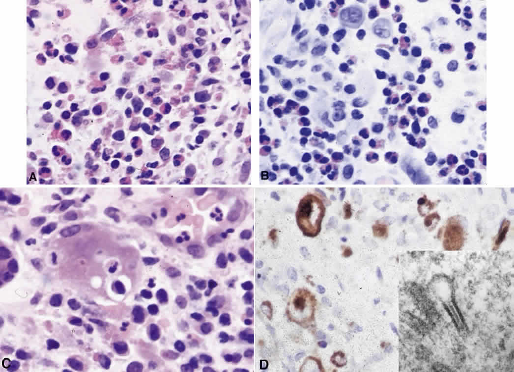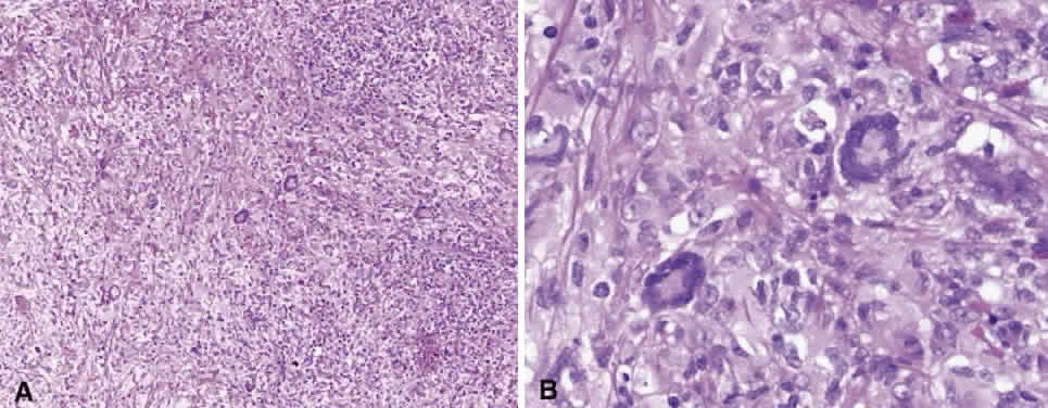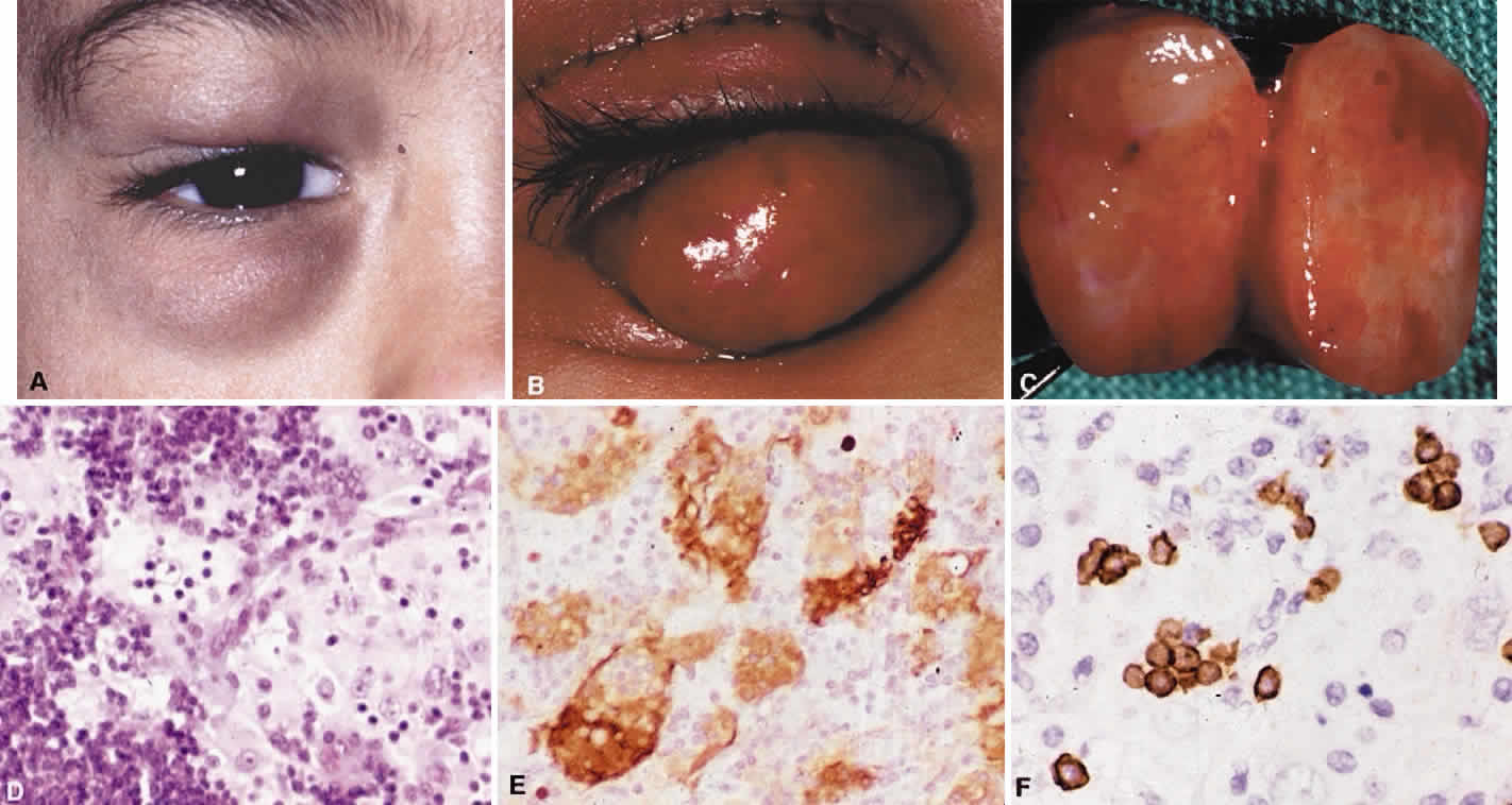 NECROBIOTIC XANTHOGRANULOMA Necrobiotic xanthogranuloma presents in older persons in association with plasma cell dyscrasia and monoclonal gammopathies, and work-up requires serum protein electrophoresis to identify any underlying etiology.204,205 The granulomas consist of histiocytes, Touton giant cells, and xanthoma cells. What distinguishes the lesion histologically from ErdheimChester or juvenile xanthogranuloma is the necrotic focus of these granulomas. They present in subcutaneous skin, including the periocular region, as waxy, erythematous, and indurated lesions, and patients may have hepatosplenomegaly, leukopenia, and an increased erythrocyte sedimentation rate. Treatment of systemic involvement with chemotherapy generally also causes regression of cutaneous and orbital lesions. PALISADING NECROBIOTIC GRANULOMA Palisading necrobiotic granulomas are idiopathic subcutaneous necrobiotic granulomas that resemble rheumatoid nodules but occur in otherwise healthy patients. They can occur in the periocular skin at the orbital margin and medial canthal region but also have been reported in the orbit206–208 (Fig. 31). Histologically, they are composed of palisading granulomas of histiocytes with rare multinucleated giant cells around an area of necrosis and fibrosis (Fig. 32). There may be associated infiltrates of lymphocytes and plasma cells. The granulomas require only superficial excision, since there are no systemic manifestations. Differential diagnosis includes necrobiosis lipoidica, which is associated with diabetes mellitus, or foreign-body necrobiotic granuloma secondary to traumatic foreign body or illicit drug use. SINUS HISTIOCYTOSIS WITH MASSIVE LYMPHADENOPATHY (ROSAI-DORFMAN DISEASE) Sinus histiocytosis with massive lymphadenopathy is a benign condition that causes massive, bilateral, painless cervical lymphadenopathy associated with fever, leukocytosis, elevated erythrocyte sedimentation rate, and hypergammaglobulinemia. It occurs most commonly in African and Asian children.209,210 The mediastinal, inguinal, iliac, and paraaortic nodes also may become involved, but the most common extranodal site of involvement is the orbit, which may be unilateral or bilateral.211–213 The liver, spleen, and bone marrow usually are spared. Lymph nodes become replaced by histiocytes, and, similarly, the lids or orbit are infiltrated by populations of histiocytes, which have abundant cytoplasm and engulfed lymphocytes or erythrocytes, a phenomenon referred to as emperipolesis or erythrophagocytosis (Fig. 33). The sheets of histiocytes may be separated by areas of lymphocytes in a follicular structure. The histiocytes do not contain Langerhans' granules, which differentiates this disease from the eosinophilic granuloma. Prognosis is excellent because viscera generally are spared, and the disease usually resolves spontaneously in 2 to 3 years, with chemotherapy or radiation therapy being ineffective. |
