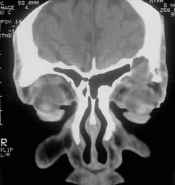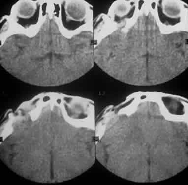 Two other intraosseous lytic histiocytic lesions occurring around the orbit have been described: the cholesteatoma and the giant cell reparative granuloma.192,193 Both lesions display proliferating histiocytes but no eosinophils. The cholesteatoma produces well-corticated lytic bone defects in reaction to local trauma (Fig. 28), whereas the giant cell reparative granulomas create a “zonal” pattern with areas of hemorrhage, fibrosis, and multinucleated giant cells.