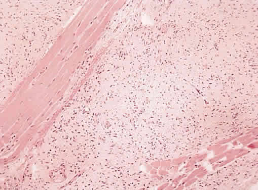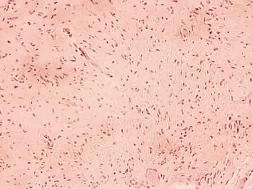 Treatment of localized neurofibromas depends on whether the lesion is producing symptoms and its location. Most of these lesions are well defined by imaging studies such as computed tomography (CT) or magnetic resonance imaging (MRI). Surgical excision through an anterior or lateral orbitotomy usually is curative. DIFFUSE AND PLEXIFORM NEUROFIBROMAS Diffuse neurofibroma and plexiform neurofibroma both are associated with neurofibromatosis; the plexiform neurofibroma is pathognomonic of neurofibromatosis type 1. Both tumors tend to present within the first few decades of life. The diffuse neurofibroma is infiltrative and not circumscribed. Many diffuse neurofibromas are solid, but they also may have a gross myxoid or gelatinous appearance at the time of surgery. Because diffuse neurofibromas feature an infiltrative growth pattern, tumor cells often can be visualized, separating muscle fibers or infiltrating adipose tissue on histologic examination (Fig. 4). The radiographic appearance is infiltrative compared with the circumscribed nature of the localized neurofibroma and schwannoma. The plexiform neurofibroma also lacks encapsulation, and radiographic evaluation may not distinguish plexiform from diffuse neurofibroma.