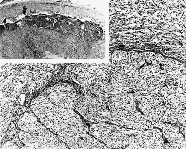 The histopathologic features of a chiasmal glioma are almost identical to those of an optic nerve glioma. Because the normal optic chiasm lacks the connective tissue septae found in the normal optic nerve, these septae are not found in chiasmal glioma specimens.71 A reactive leptomeningeal hyperplasia may surround gliomas, leading to an erroneous biopsy interpretation of meningioma23 (Fig. 9). In contrast to schwannomas and neurofibromas, which are positive for the intermediate filament vimentin, immunohistochemical analysis of cytoplasmic glial intermediate filaments in pilocytic astrocytomas reveals positive staining for glial fibrillary acidic protein.87 Electron microscopy demonstrates that the major cell type of optic gliomas is the astrocyte. Glial filaments measuring 500 to 1000 nanometers in diameter are packed into the cell processes. These may merge together into irregular masses (Rosenthal fibers) containing alpha-B-crystallin.88,89 Astrocytes form basement membrane material only where they abut on connective tissue spaces.4 Optic nerve enlargement by the tumor may be secondary to many factors, including (1) a proliferation of neoplastic astrocytes, (2) an accumulation of extracellular mucosubstance secreted by the astrocytes in cystic spaces, and (3) a reactive proliferation of arachnoidal tissue.69 Two distinct growth patterns in pilocytic astrocytomas have been described. The expansile-intraneural pattern includes thickening of the nerve parenchyma with minimal growth of the tumor into the arachnoid and minimal reactive proliferation. The second type has features of circumferential-perineural growth, involving tumor eruption and proliferation into the subarachnoid space. As mentioned in the section on imaging, the latter pattern may be more suggestive of NF-1-related gliomas.60,69 Although optic gliomas may demonstrate rapid growth despite treatment, other tumors may remain quiescent for years. Although uncommon, spontaneous regression has been reported.90 Controversy exists as to whether optic gliomas are hamartomas or true neoplasms. The tumors were first described as hamartomas by Hudson in91 In 1969, Hoyt and Baghdassarian92 supported Hudson's theory and concluded that optic gliomas represented congenital, non-neoplastic tumors with self-limited growth followed by stability. Histologic features and growth rates, however, suggest that optic gliomas are true neoplasms. Burnstine93 evaluated optic gliomas with colloid silver impregnation of nucleolar organizer region-associated proteins (AgNORs) whose size, number, and morphology indicate the pattern of cell proliferation or transformation. Optic glioma AgNOR counts were similar to optic nerve meningiomas and had features consistent with true neoplasms (Fig. 10). In a review of 623 reported cases, Alvord and Lofton2 described optic nerve growth kinetics based on time to recurrence of disease. Growth patterns had variable rates, ranging along a continuum from a simple logarithmic rate to a decelerating growth rate; these rates were not characteristic of hamartomas. Aggressive clinical tumor behavior, noted either by local tissue invasion or by remote seeding, has been described in optic glioma patients. Florid invasion of the leptomeninges by some NF-1-associated optic gliomas has been seen.60 Lourie and colleagues35 reported that in five of seven patients, extension of the tumor into the lateral geniculate bodies and optic radiations had occurred. They concluded that this synapse site in the visual pathway was not a barrier to tumor spread. de Keizer and co-workers94 reported on a 3-year-old child with NF-1 who had an optic glioma with intraocular extension and subsequent malignant degeneration within the glial tissue. Both lumbar spinal metastases from optic pathway gliomas95–97 and malignant ascites from spreading of glioma cells through a ventriculoperitoneal shunt98 have been described. |