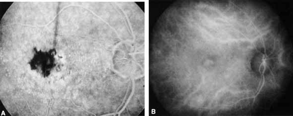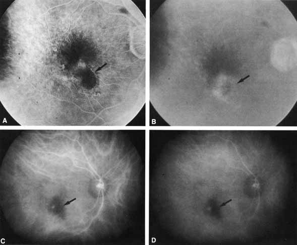 PATHOPHYSIOLOGY OF CHOROIDAL NEOVASCULARIZATION In AMD, it has long been postulated that focal choroidal ischemia may play a role in the development of CNV. Macular choroidal vascular “watershed” zones have been known to exist, but their causal relationship to CNV has never been determined. On ICG angiography, these presumed watershed zones appear as areas of relative, abnormal hypofluorescence in the early phases of the angiographic study.44 A published ICGA analysis by Ross et al.45 revealed a much higher incidence of the presumed watershed zones in the macula of eyes with AMD compared with age-matched control eyes (55% vs. 15%, respectively). Furthermore, Goldberg et al.46 found that 92% of eyes that developed choroidal neovascular membranes had watershed zones. These data support the notion that watershed zones play a role in CNV development and that ICG angiography may be useful once again in identifying eyes at the highest risk for the exudative transformation. Other studies have shown that ICGA can distinguish the different types of drusen and, therefore, may be useful to evaluate the risk of progression of AMD.47 CLASSIC CHOROIDAL NEOVASCULARIZATION Classic CNV as determined by FA shows a similar appearance on ICGA with well-defined hyperfluorescence throughout the transit phase and leakage obscuring the borders of the lesion in the late frames. However, the leakage in the late frames tends to be less pronounced with ICGA. Overall, ICGA offers no advantage over fluorescein angiography in this setting. OCCULT CHOROIDAL NEOVASCULARIZATION Occult CNV assumes a variety of FA patterns.48 There can be obscuration of the neovascularization from fluorescein blockage by overlying fluid or pigment or from rapid leakage of the dye in the area of interest. Sometimes there is slow, irregular fluorescein leakage with poorly delineated borders. With occult CNV, there may be varying degrees of uncertainty as to the precise location and extent of the choroidal neovascular membrane using FA alone. Both fluorescein and ICG dyes appear to be retained by CNV and will, therefore, exhibit hyperfluorescence relative to surrounding tissue.1 ICGA theoretically provides enhanced visualization of CNV in this setting because the ICG infrared fluorescence better penetrates pigment and fluid than the visible light fluorescence of sodium fluorescein, and the highly protein-bound ICG dye leaks less from abnormal vessels compared with fluorescein dye as described earlier. Several patterns of ICG hyperfluorescence for occult CNV have been observed.4,11,49,50 These include early-appearing small hyperfluorescent spots (hot spots), plaque-like hyperfluorescence, collections of abnormal vessels, and late-appearing hyperfluorescence with indistinct edges (Figs. 3, 4, and 5). A combination of these patterns can be seen. Although thin blood is easily penetrated by the infrared fluorescence (Fig. 6), thick blood will still obscure the underlying choroidal pattern to some degree. Reichel et al.51 demonstrated that ICGA was superior to fluorescein angiography in determining the extent of CNV secondary to age-related macular degeneration obscured by hemorrhage. Several investigators have demonstrated the ability of digital ICG angiography to not only confirm, but also better delineate CNV in certain cases of exudative AMD.1,3,4,10–13,33 Early large series by Yannuzzi et al.4,52 and Regillo et al.,11 using digital videoangiogram systems demonstrated well-defined hyperfluorescent foci of ICG presumably corresponding to the entire choroidal neovascular process in approximately 40% of cases, where FA revealed occult or ill-defined CNV only (see Figs. 3, 4, 5, and 6). A similar yield was reported early on by Kuck et al.,13 using SLO-based ICGA. Furthermore, studies by Regillo et al.,11 Sorenson et al.,53 and Guyer et al.54 have shown that laser photocoagulation of well-defined ICG hyperfluorescent foci with treatment guided solely by the ICGA findings resulted in short-term resolution of exudation and stabilization or improvement of vision in 56% to 69% of cases. Although prior studies with AMD patients have shown that occult or ill-defined CNV on FA have, in general, a poor visual prognosis,55,56 adequate controls are not available to determine whether laser therapy as outlined in these studies significantly altered the natural history. Nonetheless, the data suggest that treatment based on ICGA findings may result in prompt resolution of exudation and improved visual acuity in selected cases. Therefore, this technique has the potential to increase the yield of exudative AMD cases that may be effectively managed by conventional laser photocoagulation treatment methods. SERIOUS PIGMENT EPITHELIAL DETACHMENTS In contrast to the bright hyperfluorescence on FA, serous pigment epithelial detachments most often appear either isofluorescent or slightly hypofluorescent; associated hyperfluorescent CNV is, therefore, more easily seen on ICGA (Fig. 7). In AMD, a serous pigment epithelial detachment (SPED) is usually associated with CNV. However, the CNV may not be adequately visualized with fluorescein angiography because of rapid fluorescein pooling into the sub-pigment epithelial space. With ICGA, the neovascular component shows a relative hyperfluorescence, whereas the serous component of the complex is isofluorescent or hypofluorescent due to the minimal amount of ICG leakage(Fig. 7) It was initially hoped that this would lead to an increased yield of successful laser treatment of such lesions. Baumal et al.57 demonstrated that ICGA revealed CNV associated with SPED in 83% of eyes in which the CNV was not well delineated by fluorescein angiography. However, laser treatment to the presumed neovascular focus as guided by the ICGA findings did not change the visual outcome compared to controls. Lim et al.58 showed a transient stabilization of visual acuity following ICGA-guided laser photocoagulation for CNV associated with SPED. Ho