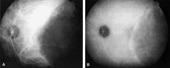management. In pathologic myopia, CNV is usually well demarcated and easily detectable with fluorescein angiography. Therefore, ICG angiography is rarely utilized in this setting. However, when hemorrhage is present, it is not unusual for fluorescein angiography to fail in differentiating between CNV and lacquer crack formation as possible sources of blood. The prognosis (and possibly management) can be very different between these sources, with the latter entity alone usually resulting in a much more favorable visual outcome. ICG angiography can be useful in this setting. Abnormal hyperfluorescence from CNV will often penetrate thin layers of blood, and lacquer cracks show as hypofluorescent rather than hyperfluorescent lines.88,89,90 There have been numerous reports of ICG angiographic findings with a variety of chorioretinal inflammatory diseases, such as multiple evanescent white-dot syndrome (MEWDS),38,91 acute posterior multifocal placoid pigment epitheliopathy (APMPPE),37,92,93 idiopathic enlarged blind spot syndrome,94 angioid streaks,95,96 Vogt-Koyanagi-Harada (VKH) syndrome,97 and multifocal choroiditis.98 In MEWDS, ICGA demonstrated multiple hypofluorescent lesions that obscured the underlying choroidal vessels.38 These spots were more apparent and widespread compared with either ophthalmoscopic or fluorescein angiographic findings. ICGA-based choroidal blood flow analysis in two patients with APMPPE revealed a significant delay in choroidal filling and large areas of choroidal vascular nonperfusion in the acute stage of the disease.37 In both conditions, the ICGA abnormalities completely disappeared as the conditions clinically resolved. Evaluation of the idiopathic enlarged blind spot syndrome with ICGA has revealed choroidal involvement with hypofluorescence involving the peripapillary area and the entire posterior pole.94 ICGA for multifocal choroiditis showed multiple hypofluorescent spots in the posterior pole. This may be useful in distinguishing CNV from acute inflammatory foci in the macula.98 Kohno et al.99 have also demonstrated via ICGA an underlying choroidopathy following blunt trauma with lack of visual recovery. ICGA has also been used to confirm the diagnosis of a vortex vein varix in a patient suspected of having a choroidal tumor.100 The technique was able to demonstrate dynamic pooling of ICG dye in the abnormal vortex vein ampulla as the field of gaze was shifted. These findings are more often of academic interest in helping elucidate disease pathophysiology and determining relationships among these disease entities. At this time, ICGA, in general, has limited routine clinical utility in these conditions. |
