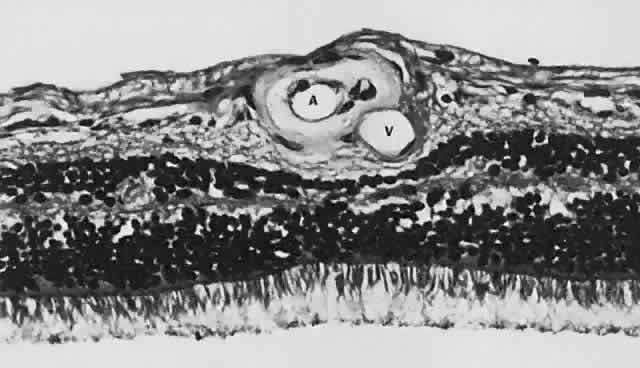 Notice that in the fovea, the obliquely oriented outer plexiform layer lies superficially, since the ganglion cell layer and nerve fiber layer are centrifugally displaced in this region. Therefore, typical nerve fiber layer hemorrhages (flame-shaped hemorrhages) are not seen in the fovea. The modifications of the retinal cytoarchitecture in the macula also affect the appearance of exudates and early retinal necrosis in this region. |