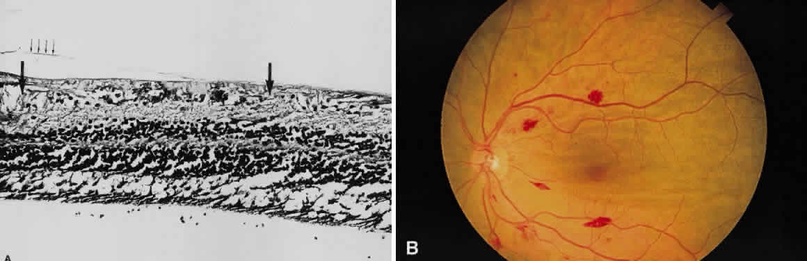 The shape of other retinal hemorrhages depends on the layer of the retina affected. The hemorrhage spreads along the plane defined by the orientation of retinal structures. Thus, a hemorrhage within the nerve fiber layer is oriented in the direction of the nerve fibers, parallel to the internal limiting membrane (seeFig. 11A) and is seen in the posterior pole as a flame-shaped hemorrhage (see Fig. 11B). In the retinal periphery, however, nerve fiber layer hemorrhages are not flame shaped but appear ophthalmoscopically as dots or blots. The explanation of this phenomenon also is related to the orientation of the nerve fiber layer. In the retinal periphery, the nerve fibers become separated and are oriented so as to form a network of round or polygonal spaces between the fibers, whereas in the posterior pole, the tight fascicular orientation of the fibers forms potential trough-like planes. The orientation of the processes of retinal cells deep to the nerve fiber layer is perpendicular to the plane of the internal limiting membrane. Therefore, hemorrhages in the deeper (or outermost) retinal layer are oriented in a cylindrical column. The ophthalmoscopist views a cross-section of this column (the cylinder end-on) and sees a dot or blot hemorrhage (see Fig. 23). |