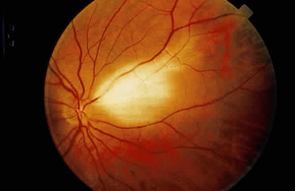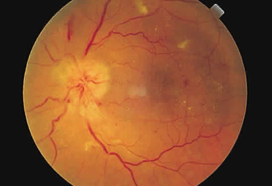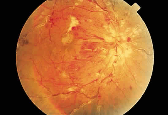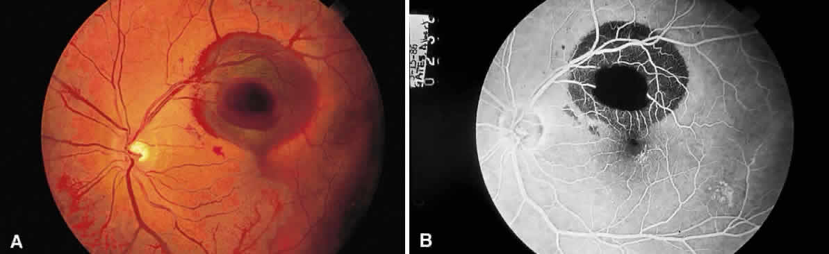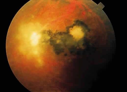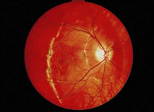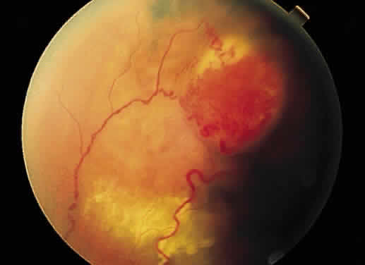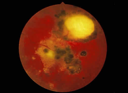 Necrotic retina has a white appearance. Necrosis may result from a variety of inflammatory conditions, including viral, fungal, and protozoal (Toxoplasma) retinitis. Each type of retinitis appears, in part, as a white retinal lesion. Cytomegalovirus retinitis (Fig. 24) resembles a pizza pie with an admixture of white (retinal inflammation) and red (hemorrhage) colors (Fig. 25). The retinal abscesses of fungal retinitis are white. Likewise, the satellite lesion of retinochoroiditis caused by active Toxoplasma (the choroidal inflammation is merely in response to the primary retinal infection) is white (Fig. 26). The white appearance of a lesion from inactive Toxoplasma results from the destruction of neurosensory retina, retinal pigment epithelium, and choroid to permit a direct view of the sclera (Fig. 27). Necrosis in retinal-derived neoplasms is white; the appearance of regressed (necrotic) retinoblastoma often is described as “cottage cheese.”10