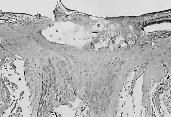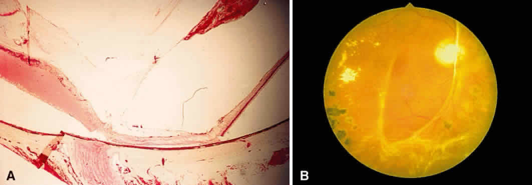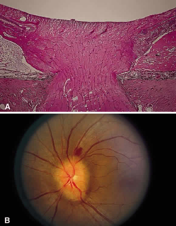 Finally, fibrous tissue may enter the eye through a perforating wound. The sclera does not heal itself by proliferating and bridging a dehiscence. Instead, healing is achieved by tissue from the episclera and the choroid. Occasionally, episcleral tissue enters the eye as a fibrous ingrowth and may be seen even at the site of surgical scleral wounds, such as sclerotomy portals for pars plana vitrectomy (Fig. 20). Gliosis is akin to fibrosis as a mechanism of repair. Repair in tissues of the central nervous system is accomplished by gliosis. Since the neurosensory retina originates embryologically from an outpouching of the central nervous system, repair within the retina is accomplished by gliosis. The Müller cell, thought to be responsible for this repair, also may migrate through a break in the internal limiting membrane and contribute to the formation of preretinal membranes. It also may migrate into the retroretinal space to contribute to membranes in this area. Glial membranes, if thin, may be transparent, but abundant glial tissue may have a white color. In nonglaucomatous optic atrophy, such as the change that occurs after an infarct of the optic nerve (i.e., arteritic or nonarteritic optic neuropathy), the loss of tissue substance is accompanied by the proliferation of glial tissue. The combination of gliosis and a decrease in the vascular supply to the nerve head accounts for the whiteness of the disc (see Fig. 7). The pathologic correlate of the “waxy pallor” of the disc in retinitis pigmentosa is similarly attributable to decreased vascular supply and gliosis.5 Occasionally, gliosis and fibrosis occur together. Preretinal membranes may be composed entirely of glial cells (Müller cell derivatives) or may involve the proliferation of retinal pigment epithelial cells and glial cells, especially in the presence of a retinal break, which allows the pigment epithelial cells access to the preretinal space. Frequently, cells with ultrastructural features of both fibroblasts and smooth muscle cells, myofibroblasts, may be found in preretinal and subretinal membranes.6 These cells are thought to originate from pigment epithelial cells. The myofibroblasts are capable of secreting collagen as well as contracting, accounting for the wrinkling of the internal limiting membrane, as seen in “macular pucker” and proliferative vitreoretinopathy. Myofibroblasts also have been implicated in the contraction of iris neovascular membranes (ectropion uveae), cyclitic membranes, and the organization of intraocular hemorrhage.7 The white “snow bank” seen on the inferior pars plana and retinal periphery in chronic pars planitis represents organization of inflammatory protein and cells with contributions from glial cells as well as fibroblasts (presumably derived from nonpigmented ciliary epithelium).8 Organization of old vitreous hemorrhage also may appear white for similar reasons. Myelin appears white (the difference between white and gray matter in the central nervous system is myelin produced by oligodendroglia). Normally, myelinization of the optic nerve axons proceeds centrifugally from the nervous system and halts at the level of the lamina scleralis. Recall that the axons of the optic nerve constitute the nerve fiber layer of the retina and that the cell bodies of these axons reside in the ganglion cell layer of the retina. Therefore, myelinated nerve fibers in the retina have a superficial appearance ophthalmoscopically because of their location in the nerve fiber layer. Their white appearance results from myelin. They frequently have feathery edges because the myelinization does not halt abruptly (Fig. 21).
